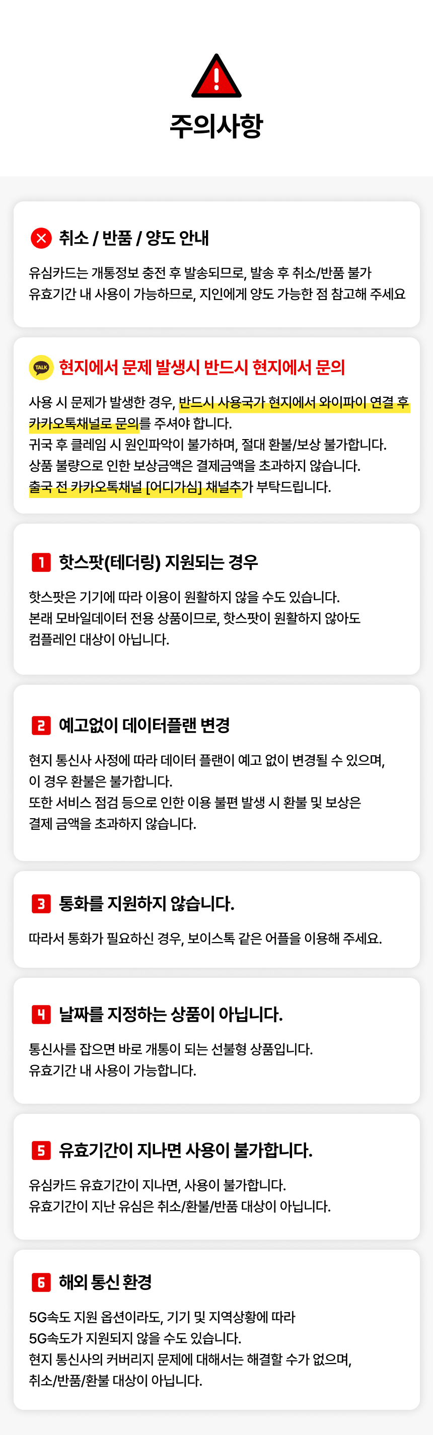 출국/구매 전 안내사항 ▼ 컨트리락 & 보호잠금 서비스 해지 (필수) 유심보호 서비스에 가입되어 있는 경우 해외유심 사용 불가 해외에서 폰을 구입한경우, 리퍼받은 아이폰의 경우 확인 필수! (통신사 114 / 한국 아이폰센터 080-333-4000) 현지에서 유심 사용이 안될 경우 ▼ 유심사용이 안될경우 꼭!! 해외 현지에서 연락주세요. 주말 새벽에는 간혹 통신사에서 긴급 점검을 하는 경우가 있습니다. 긴급점검이 진행되는 동안에는 일시적으로 이용이 불가합니다. 개통 후 유심사용시 데이터로밍, 모바일 데이터 활성화 (ON)후 이용해 주세요 연결이 되지 않을 경우 설명서대로 진행해보고 카카오톡채널 문의하기 본 상품은 현지 통신사에서 제공하며, 현지 통신사에 의해 상품스펙, 금액 등이 예고없이 변경될 수 있습니다. 통신사에 의해 상품스펙이 변경된 경우 환불이 불가합니다. 이용중 유의사항 ▼ 데이터 속도는 이용장소의 통신환경, 휴대폰기종에 따라 4G LTE 또는 3G/ 2G/ EDGE/ GPRS 로 자동 연결되며, 통신 환경에 따라 일시적으로 이용이 불가할 수 있습니다. 속도가 너무 느릴경우, 꼭 설명서에 기재된 방법대로 진행해 주세요 현지번호가 발급되지 않는 유심은 그랩/우버/리프트 등의 앱에서 현지번호 인증이 불가합니다. 그랩/우버/리프트 앱을 이용하실 분들은 한국에서 미리 인증을 받고 앱 내 채팅 및 사진전송 기능을 통해 기사님과 연락하시면 됩니다. 해외 유심을 이용하는 동안에는 국내문자 수신불가 택배수령 안내 ▼ 택배수령으로 인해 출국일기준 최소 3일 전까지 주문해 주세요. 평일기준 (주말/공휴일 제외) 오후2시 주문건까지 당일출고 됩니다. 수령일자는 출고후 다음날 택배사 운송장조회를 통해 확인이 가능합니다.