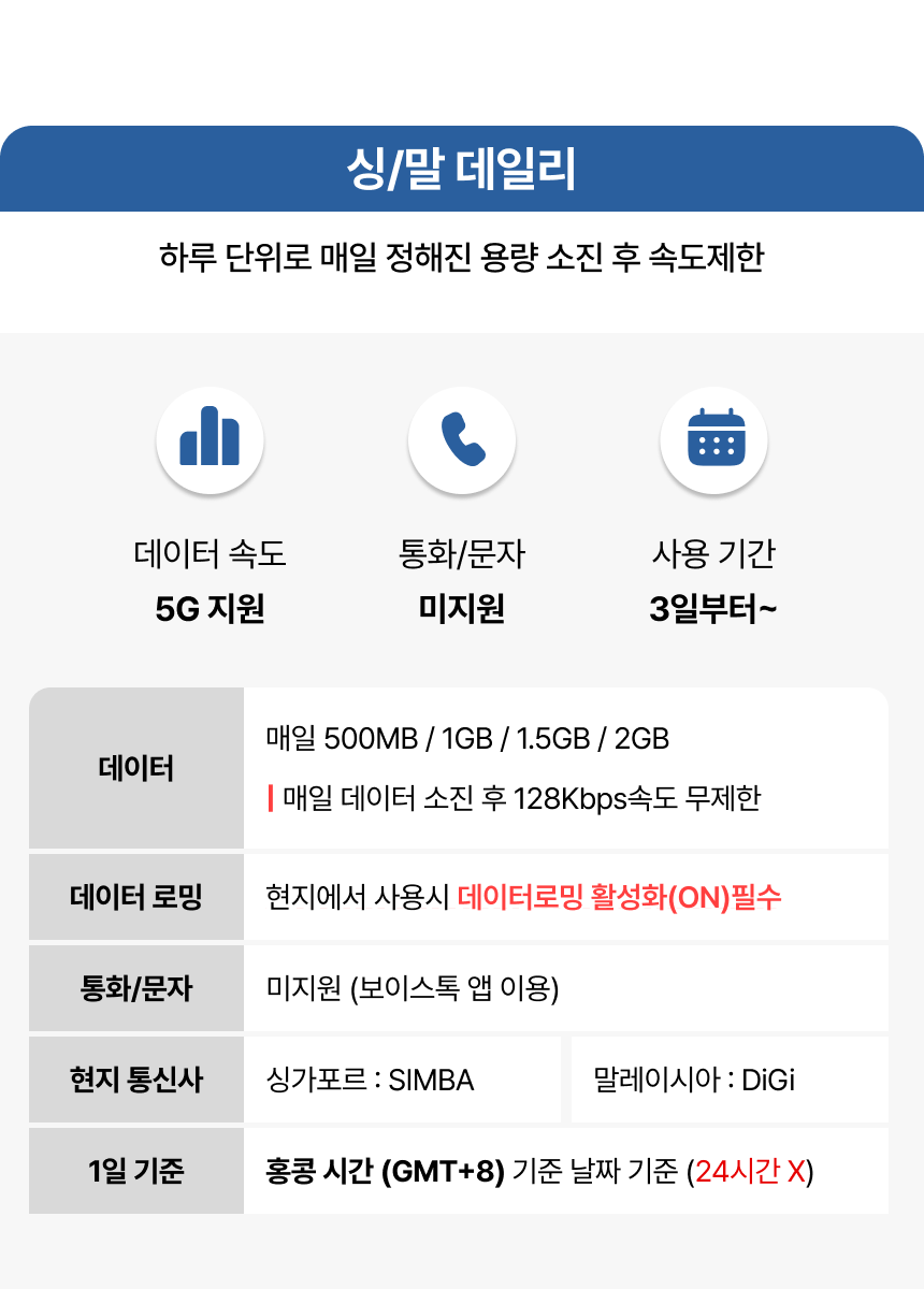 싱/말 데일리 : 매일 1GB/2GB 소진 후, 저속 무제한