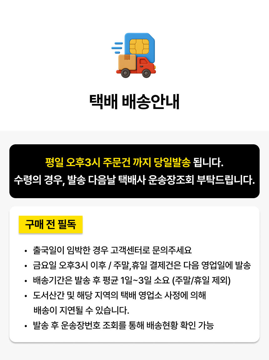 유심 발송 : 평일 (주말/공휴일 제외) 기준 오후 2시 결제 건까지 당일 택배 발송