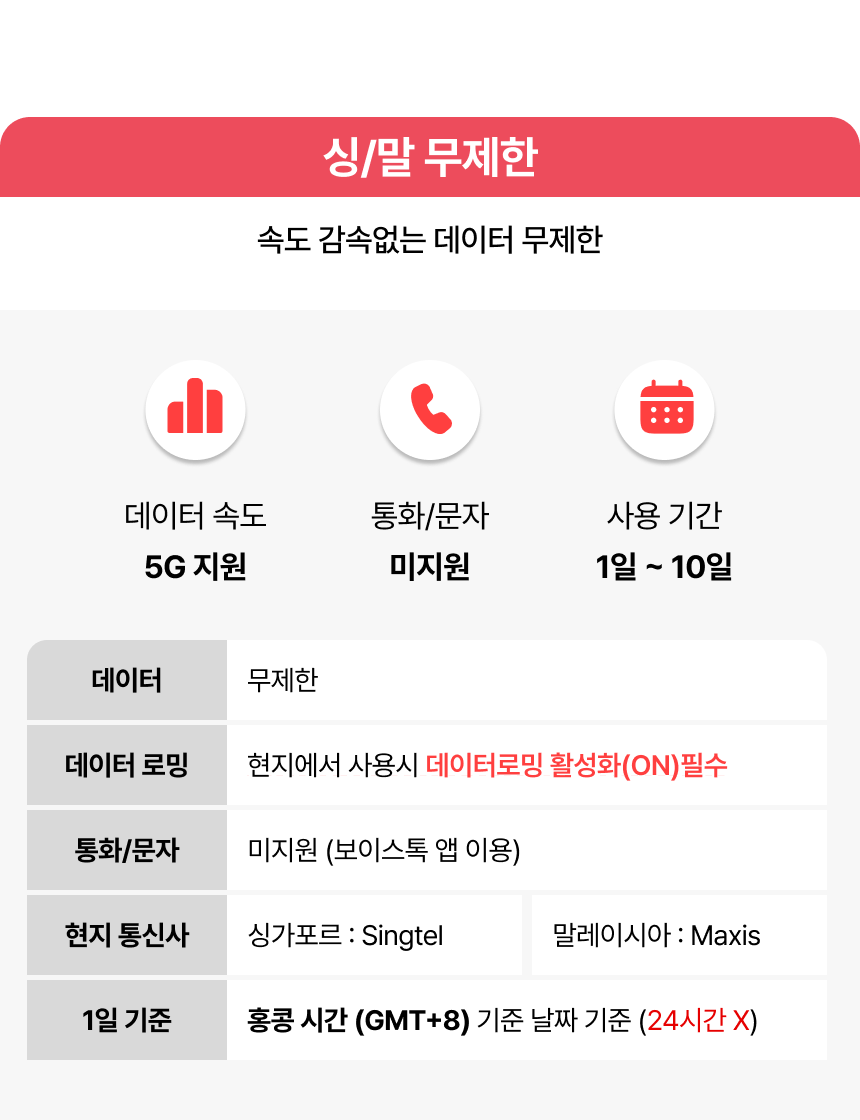 싱가포르,말레이시아 에서 데이터 걱정없이, 무제한으로!!