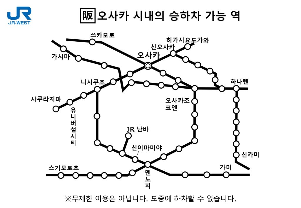 ■ 오사카 시내의 승하차 가능역 - 이용 가능한 지역의 자세한 노선도는 다음을 참고해 주세요.https://www.westjr.co.jp/global/kr/ticket/pass/one_way/pdf/osaka_city.pdf
