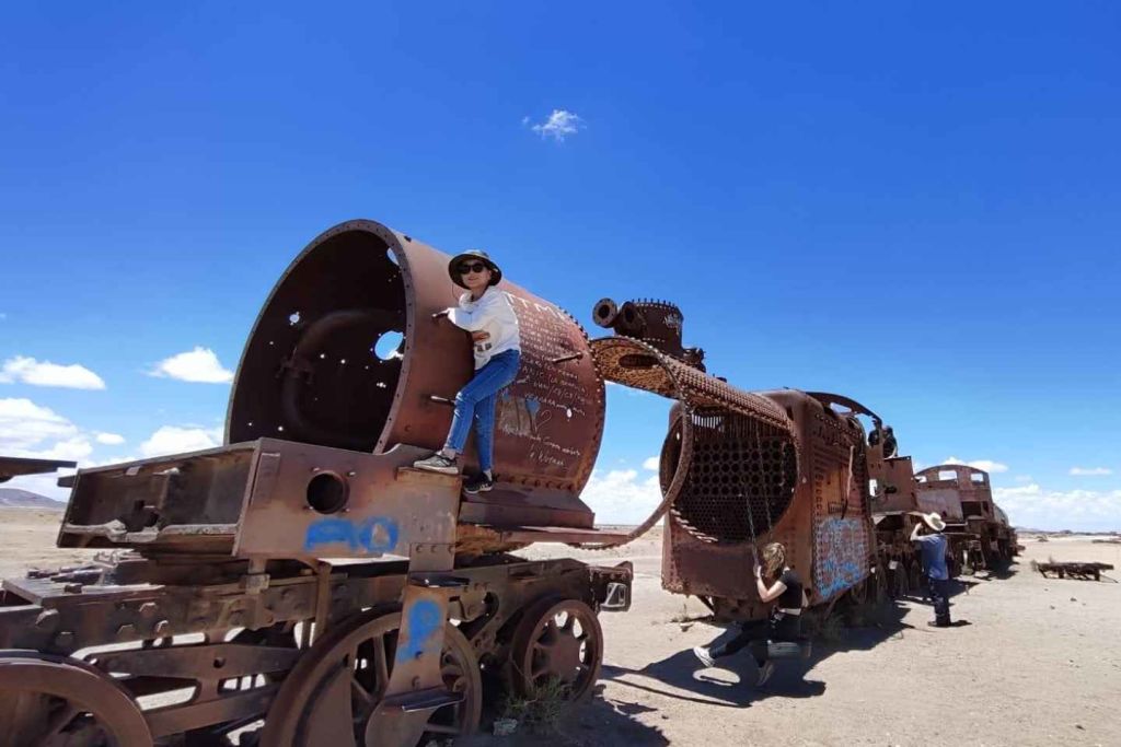 9시간 동안 버스를 타고 이동한 후 사무실로 이동하여 맛있는 아침 식사를 즐긴 후 우유니 소금 평원과 다채로운 라군 투어를 시작합니다. 첫 번째 정차 지점은 "기차 묘지"로, 이곳에서 오래되고 낡은 기차를 볼 수 있습니다.