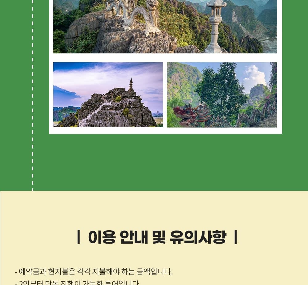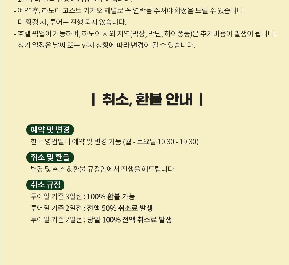 * 카카오채널로 연락주셔야 예약확정 가능하니 반드시 예약시에는 해당 카카오 채널로 연락바랍니다. (카톡검색시 @하노이고스트투어) * 베트남 국/공휴일에는 인건비, 차량비 등이 인상되는 관계로 추가금(현지지불 등)이 발생될 수 있습니다.