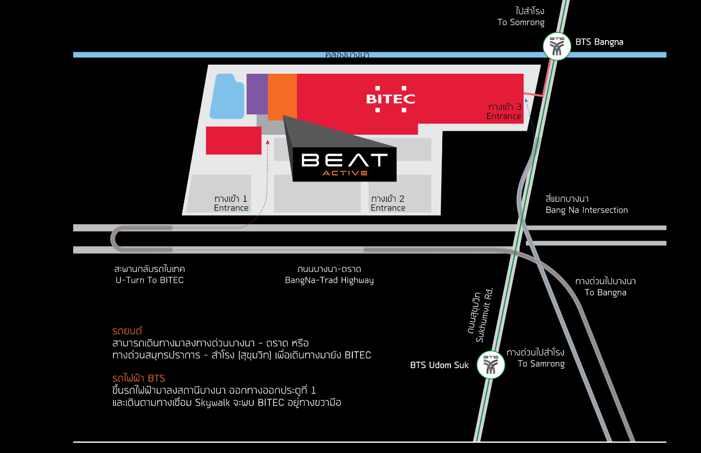 BTS 방나(Bang Na)역 1번 출구 이용 시 도보로 바이텍 (BITEC) 건물 진입 가능 합니다. (10분 소요)
