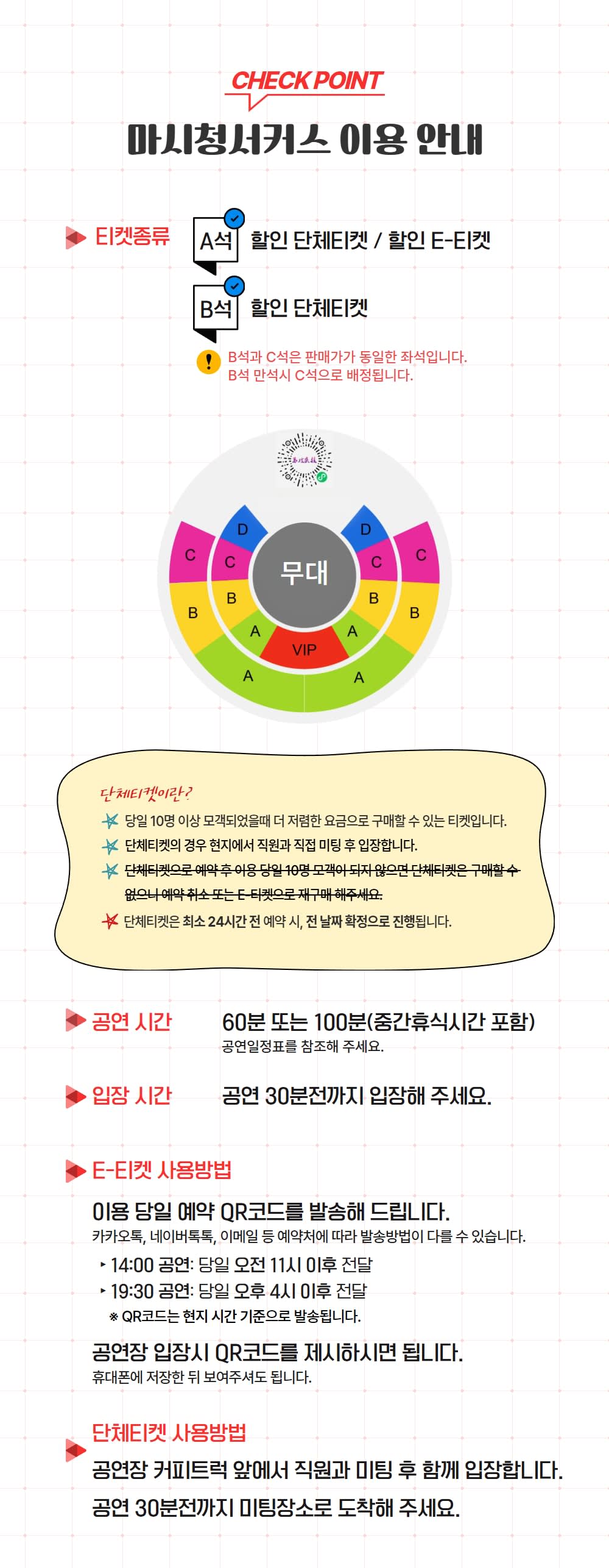 • 단체할인 티켓은 공연 30분 전 미팅장소에서 직원과 미팅 후 단체 입장 및 좌석 안내를 받습니다. • E-티켓은 개별 예약코드로 공연장에서 확인 후 입장 및 해당 좌석번호에 착석하여 관람하게 됩니다.