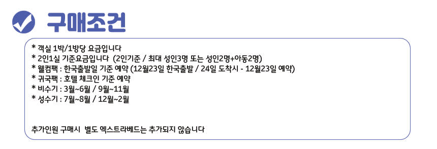 [포함사항] - 웰컴팩 항공편명에 맞는 공항픽업 - 귀국팩 귀국 항공편명에 맞는 공항 이동 [불포함사항] - 기타 개인 경비 - 생수