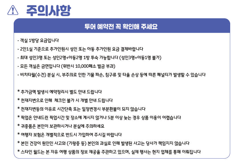 ✅ 예약안내 1. 결제 및 예약 완료 2. 스타인월드에서 개별 메시지 발송 3. 메시지에서 안내 받은 신청서를 통해 상세 투어 내용 전달 4. 상세 투어 일정 확정 및 안내 5. 스타인월드 직영으로 바우처가 필요 없으며 확정한 일정에 맞춰서 행사 진행 (투어 전날 현지 투어 안내문 발송함) 본 상품은 예약이 진행되는 상품이며 최종 확정 안내는 채널톡 연결 후 개별 안내드립니다 연결이 안될시 예약상품은 취소될 수 있습니다 채널톡 : 스타인월드_세부 [한국 스타인월드 근무시간] * 취소 접수 기준 : 영업일 기준 평일 오전 10:00 ~18:00(주말&공휴일 제외) * 운영시간 이후 접수 건은 다음 영업일 기준으로 적용됩니다. - 개별 여행자 보험에 가입을 권장드립니다. - 본 상품은 고객 결제 후 해피콜/해피톡 때 여행 출발에 대한 최종 확정 여부를 결정하며,출발 확정 이후 취소 시, 귀책사유에 따라 약관에 따릅니다. 구매 전, 약관 내용을 반드시 숙지하셔서 신중한 구매 부탁드립니다. - 최소 출발인원 미 충족 시 여행표준약관 제9조에 따라 여행사는 여행출발 2일 전까지 여행계약을 일방적으로 해제하고 소비자에게 통보할 수 있습니다. 여행 참가자 수의 미달로 여행개시 2일전까지 여행계약 해지 통보 시 여행신청금은 전액 환급 또는 날짜변경으로 안내드립니다.