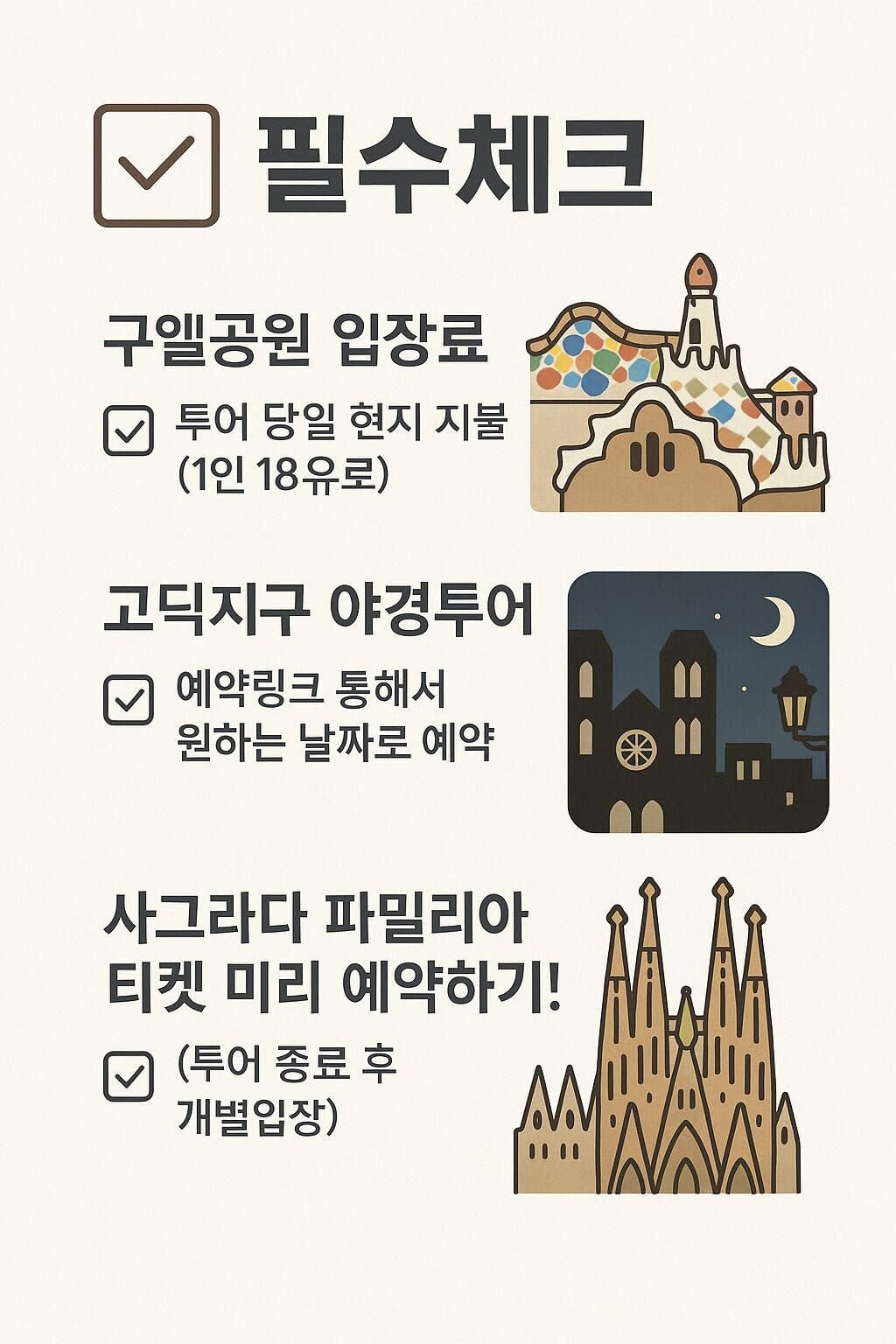 스페인에서 더 많은 투어를 즐기고싶다면, 👉 에서 확인해보세요!──────────────📸 MC 투어와 함께 편안한 차량 이동! 구엘공원 해설과 가우디 반일 투어를 즐기며 깊이 있는 역사와 문화를 배우는 특별한 경험!