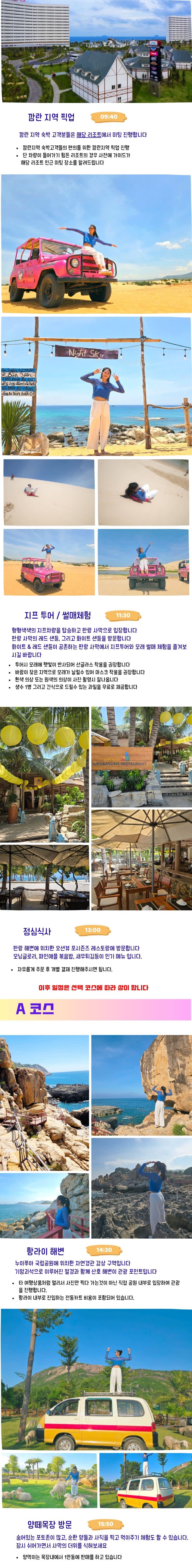 • 일정중 프로그램 및 입장권 포함 (사막 지프투어, 빙히 산호 보트 투어, 항라이, 양떼목장 등)
