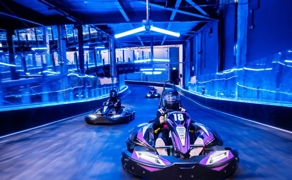 * 싱가포르 최초의 실내 게임형 전기 고카트 서킷에서 다단계 트랙, 급커브, 멋진 조명 속을 질주하세요.