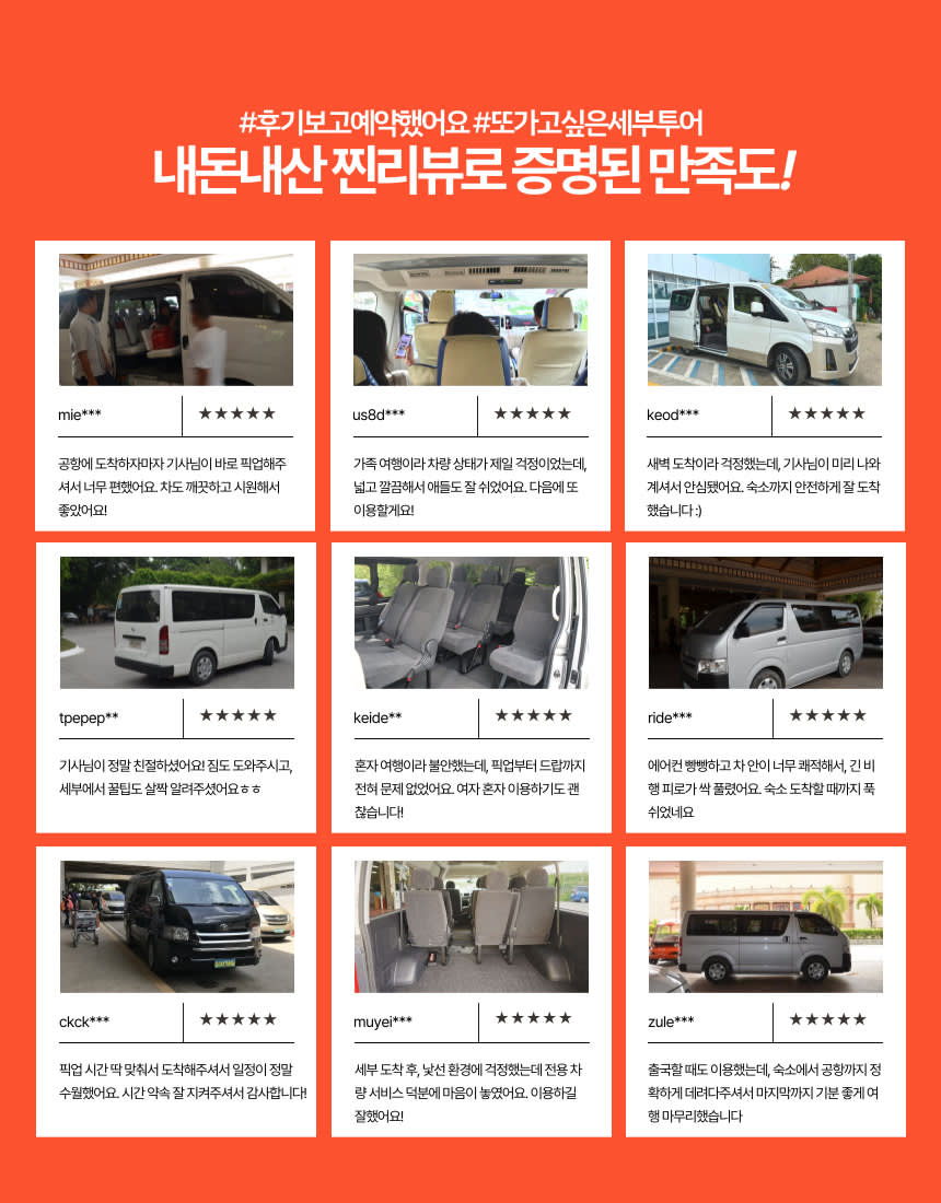 여행의 시작은 설렘과 함께, 그리고 마무리는 편안함과 함께합니다. 정식 등록된 믿을 수 있는 차량과 경험 많은 운전자가 함께하여, 세부 공항에서 숙소까지, 또는 숙소에서 공항까지 안전하고 편안하게 이동하실 수 있습니다.