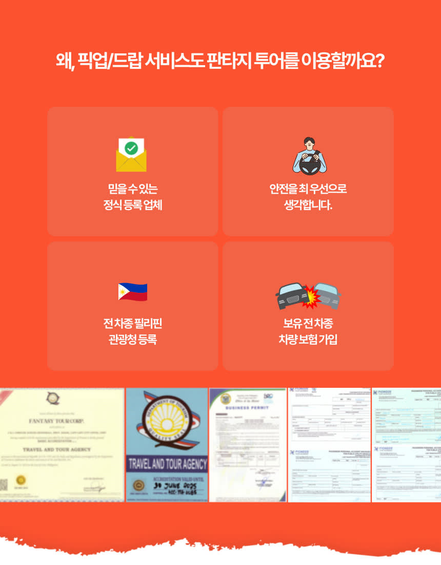 믿을 수 있는 정식 등록 업체, 전 차종 필리핀 관광청 등록, 전 차종 차량 보험 가입