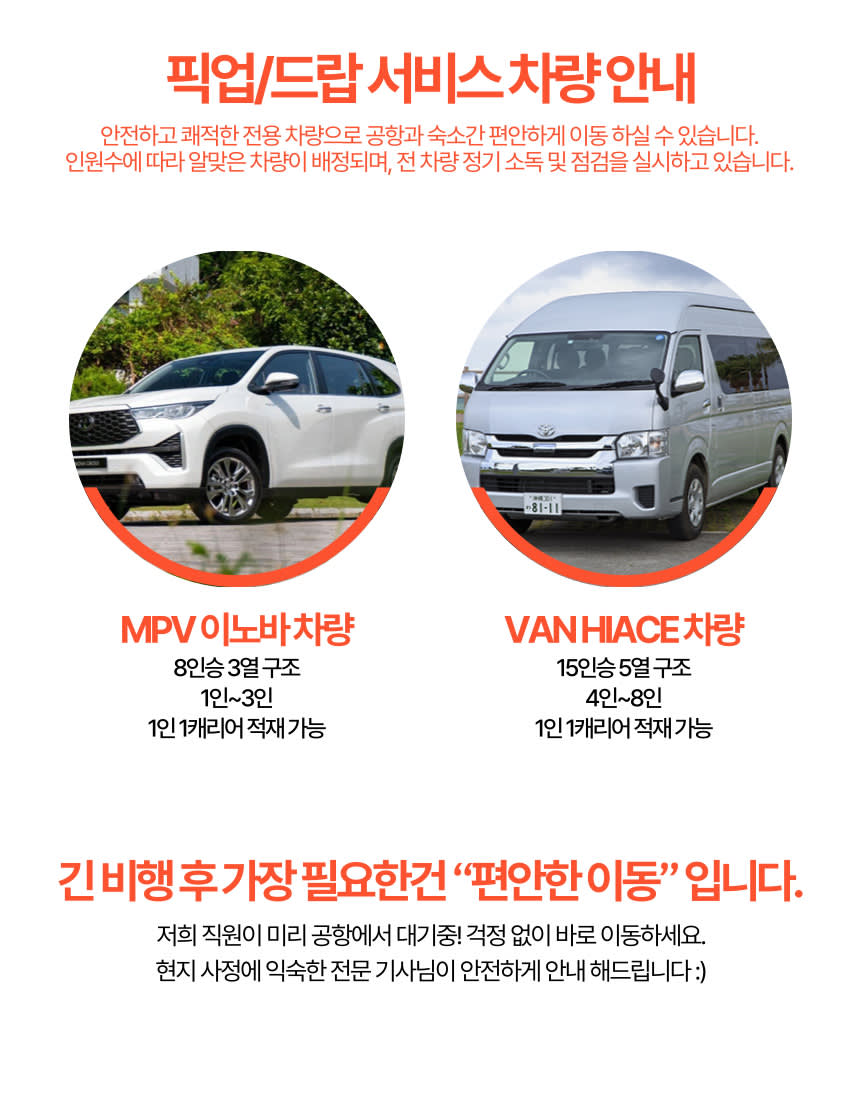 ✈️ 예약 전 안내사항 여행 중 예상치 못한 상황에 대비해, 개별 여행자 보험 가입을 권장드립니다. 예약이 확정되면, 카카오톡을 통해 픽업 관련 상세 내용을 안내드려요. 한국 출발 항공편 정보와 세부 도착 일시를 꼭 기재해주세요. 이 상품은 편도(픽업 또는 드랍 중 한 번) 이용 기준입니다. (왕복 아님) 🚗 차량 안내 인원 수와 짐의 양에 맞춰 아래 차량 중 배정됩니다. 이노바(MPV 또는 소형 밴) : 1~3인 + 캐리어 1~3개 밴(VAN) : 4~8인 + 캐리어 4~8개 ※ 유아용 카시트 제공불가 ※ 예약 시 반드시 세부공항 도착 날짜, 항공편명, 도착 시간을 정확히 적어주세요. ★포함사항★ 고객님의 편안한 첫걸음을 위해 준비했어요. ✋ 공항 미팅 – 정해진 장소에서 피켓을 들고 기다리는 미팅맨이 반갑게 맞이하며, 차량까지 안전하게 안내해드립니다. 💧 시원한 생수 1병 – 긴 비행 뒤, 성인 1인당 시원한 물 한 병으로 작은 여유를 전해드립니다. 🚘 전용 차량 – 이노바 혹은 밴 차량으로 쾌적하고 넉넉하게 이동하세요. 👨✈️ 친절한 기사님 – 현지 도로에 익숙한 기사님이 안전하게 목적지까지 모십니다. ⛽ 유류비·주차비·통행료 포함 – 추가 비용 걱정 없이, 처음부터 끝까지 편안하게. 여행의 시작부터 마무리까지, 작지만 세심한 배려로 함께하겠습니다.