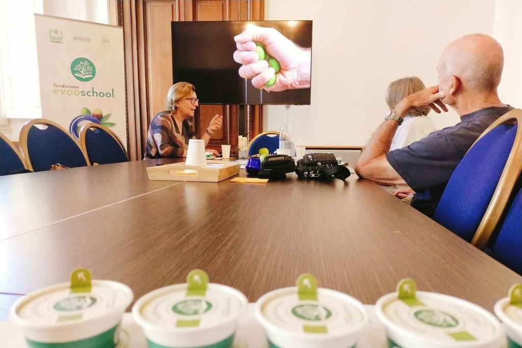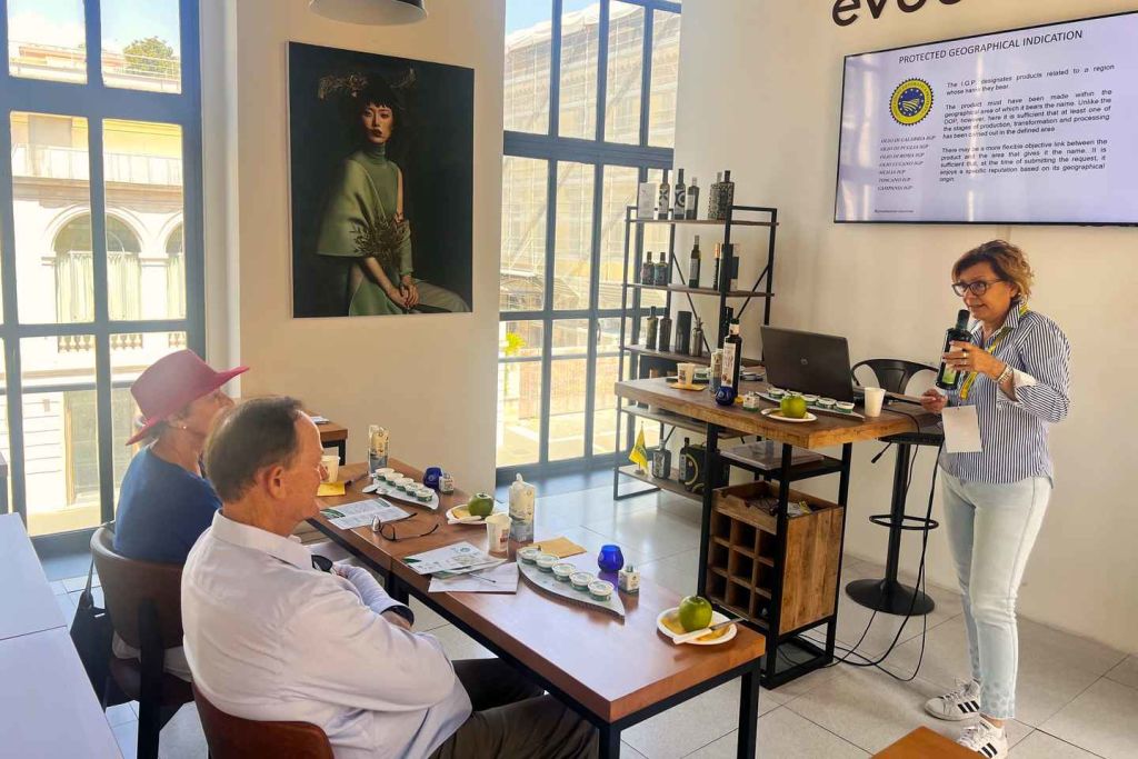 이탈리아 올리브 오일 컨소시엄의 인증을 받은 전문 오일 테이스터와 함께 "액체 그린 골드"와 테이블 올리브의 비밀을 알아보는 감각을 훈련하세요.