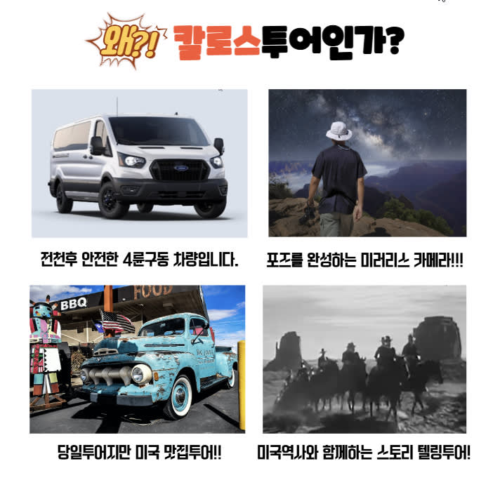 여행의 또 다른 즐거움인 맛집찾기! 정통 텍사스 BBQ를 맛볼수 있는 최고의 기회입니다. 여행의 안전을 위해서 차량은 7인승 SUV, 15인승 밴을 기본으로 갖추었고 즐거운 여행을 위하여 최소 4인부터 최대 12인까지이며 앤텔롭밸리와 홀슈밴드의 하이킹때문에 어린아기 ( 카시트필요 )와 애완동물은 불가입니다.
