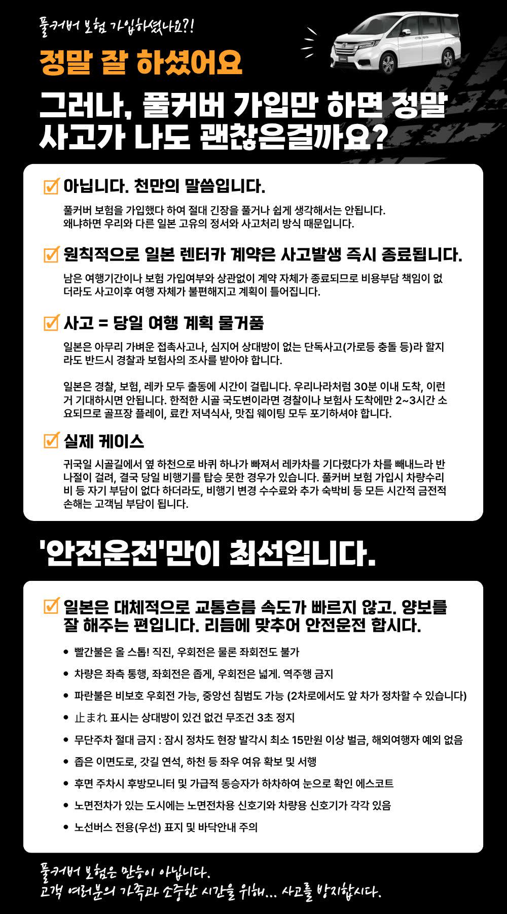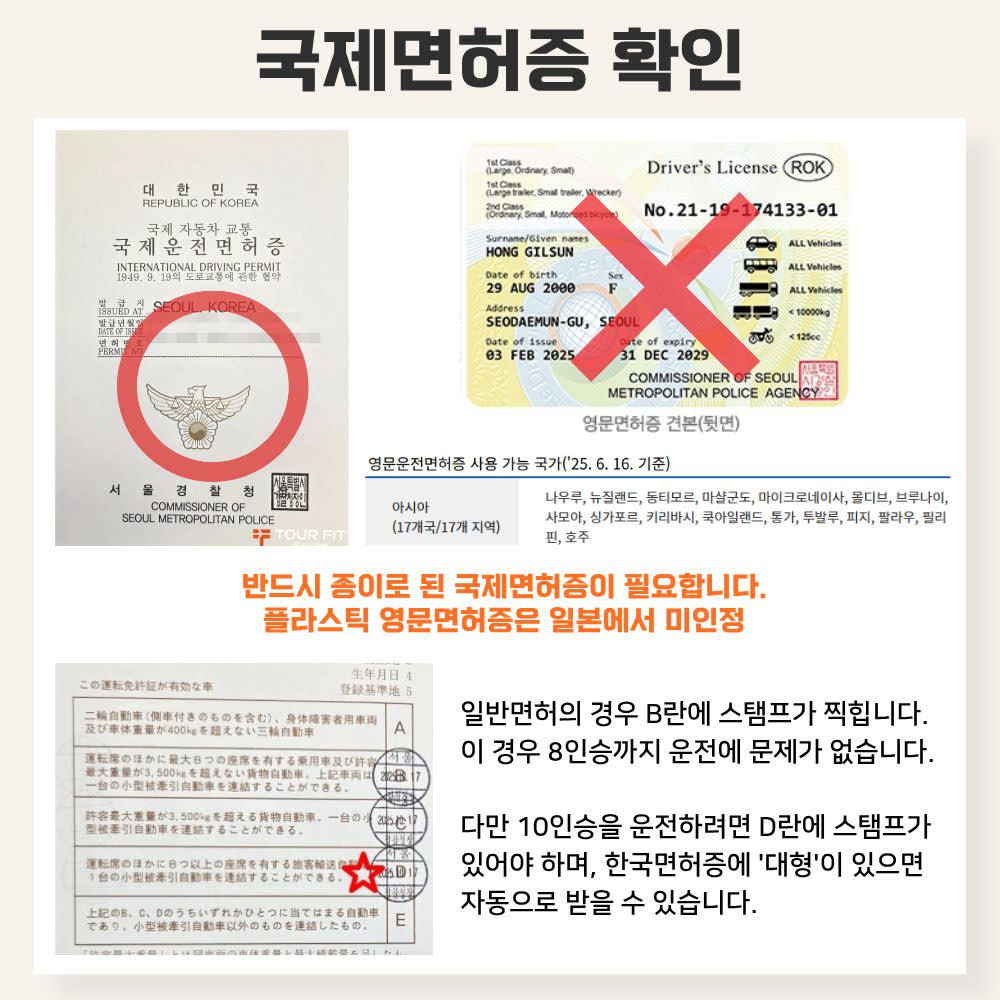 국제 운전면허증 필수 소지 (플라스틱 영문면허증 불가) 1박2일 선택시 오늘 9시부터 내일 19시 사이 언제건 출반납 가능(예약시 출도착 시간은 선택필요) 대인, 대물, 자차, NOC면제 모든 것이 포함된 풀커버 보험 가입요금