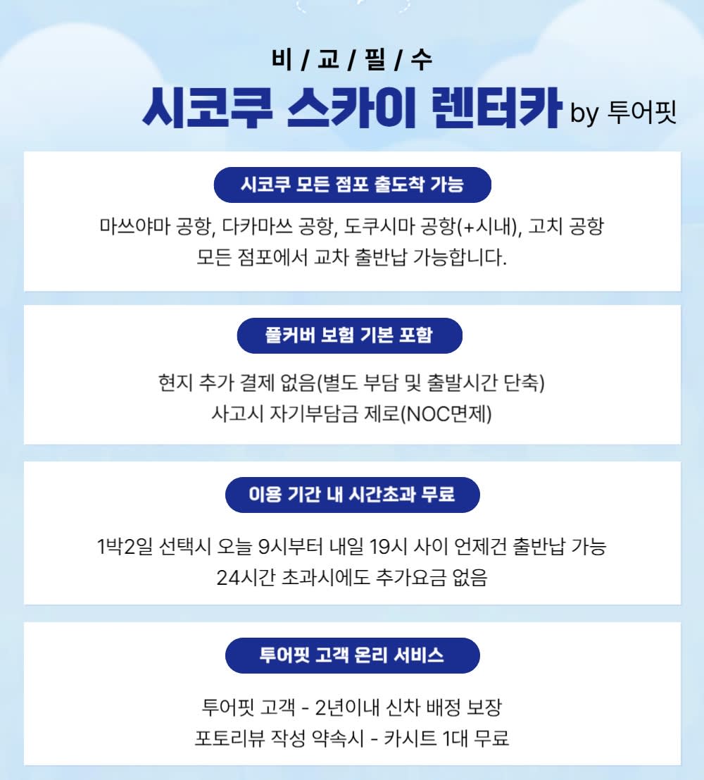 마쓰야마, 다카마쓰, 도쿠시마, 고치 전 지점에서 출도착 및 편도반납 가능한 렌터카입니다.