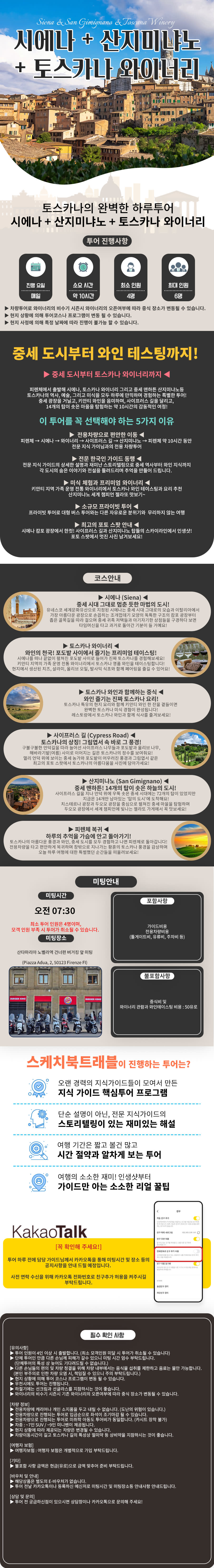 ✅ 투어 코스 * 시에나: 피렌체와 경쟁했던 중세 도시 시에나의 중심, 캄포 광장에서 이탈리아의 여유를 만끽하세요 * 와이너리: 토스카나 대표 와인 생산지 '끼안띠'에서 다양한 와인을 시음하고 와인의 역사를 배워보세요 * 사이프러스 길: 아름다운 경관과 함께 토스카나의 경제적 풍요를 상징하는 사이프러스 길에서 '인생샷'을 남겨보세요 * 산지미냐노: '탑의 도시' 산지미냐노에서 중세의 모습을 상상하며 국보급 젤라또를 맛보세요 ✅ 포함 사항 * 가이드 비용 * 전용 차량 비용: 톨게이트비, 유류비, 주차비 등 차량 운영에 필요한 모든 비용 ❌ 불포함 사항 (개별 준비) * 와인 테이스팅 비용: 1인당 50유로 * 점심 식사 비용 * 와이너리 내부 관람 비용 ⏰ 미팅 정보 * 미팅 시간: 07:30 AM * 미팅 장소: 산타마리아 노벨라역 건너편 버거킹 앞 미팅 (Piazza Adua, 2, 50123 Firenze FI) 🔔 필수 확인 사항 * 최소 출발 인원: 4명 이상 시 출발하며, 인원 미달 시 투어가 취소될 수 있습니다 * 미팅 시간 엄수: 단체 투어 특성상 미팅 시간을 지키지 않을 경우 기다려드리기 어렵습니다 * 차량 내 규정: 차량 내부에서는 물 외 음료 및 음식물 섭취가 제한됩니다 * 현지 상황: 현지 상황에 따라 투어 코스가 변동될 수 있으며, 우천 시에도 투어는 정상 진행됩니다 * 비수기에는 와이너리 오픈 여부에 따라 중식 장소가 변경될 수 있습니다 * 준비물: 장거리 이동으로 멀미약 등 상비약 지참을 권장합니다. 하절기에는 선크림과 선글라스를 챙겨 주세요 * 차량 정보: 캐리어 등 개인 소지품은 도난 위험으로 인해 차량에 두고 내릴 수 없습니다. 미취학 아동도 투어비가 동일하며, 카시트 장착은 불가합니다 * 여행자 보험: 개별적으로 가입해 주셔야 합니다 * 기타: 불포함 금액은 유로 현금으로 준비해 주세요. 예약 확정 후 카톡 또는 연동된 전화번호를 남겨주시기 바랍니다 * 바우처: 별도의 E-바우처는 없으며, 투어 전날 카카오톡으로 상세 안내를 드립니다 * 궁금한 점은 '스케치북 트래블' 카카오톡 채널로 문의해 주세요 ❗️취소/환불 규정 (여행일은 현지 시각 기준) * 여행시작 30일 전까지 (~30) 통보시 : 여행 요금 전액 환불 * 여행시작 20일 전까지 (29~20) 통보시 : 상품 요금의 20% 공제 * 여행시작 7일 전까지 (19~7) 통보시 :상품 요금의 30% 공제 * 여행시작 4일 전까지 (6~4) 통보시 :상품 요금의 50%공제 * 여행시작 당일까지 (3~당일) 통보시 : 취소/환불 불가
