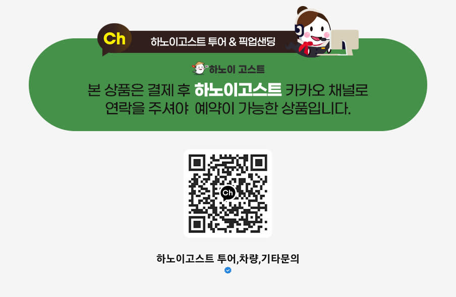 http://pf.kakao.com/_KRKgb/chat - 예약 접수 후, 위 카카오 채널 추가하여 여행자명과 상품명 아래와 같이 남겨 주시기 바랍니다. - 트리플을 통해 하노이 ooo 투어 예약한 000 입니다.