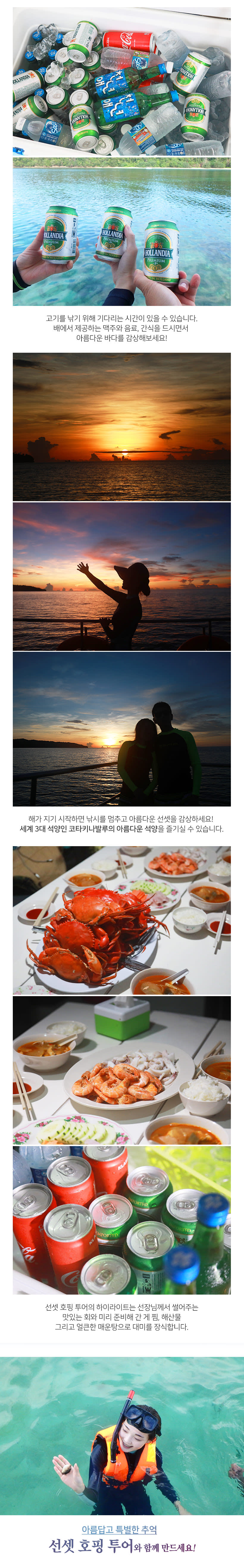 스노클링부터 낚시, 선셋 감상, 저녁식사까지 한번에 할 수 있는 알짜배기 투어!시원한 음료와 술 그리고 맛있는 해산물을 배 위에서 즐겨보세요~해양 액티비티를 좋아하는 분들에게는 가장 완벽한 오후 투어입니다!