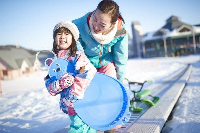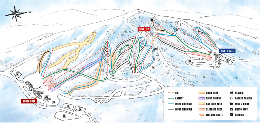 남쪽 에리어(구 알츠 반다이)에는 스노우 에스컬레이터도 있어, 북쪽 에리어(구 고양이 마스키장)에도 와이드한 완사면이 있어, 썰매 놀이나 첫 스키 스노보드에도 추천. 수업 프로그램도 충실합니다.