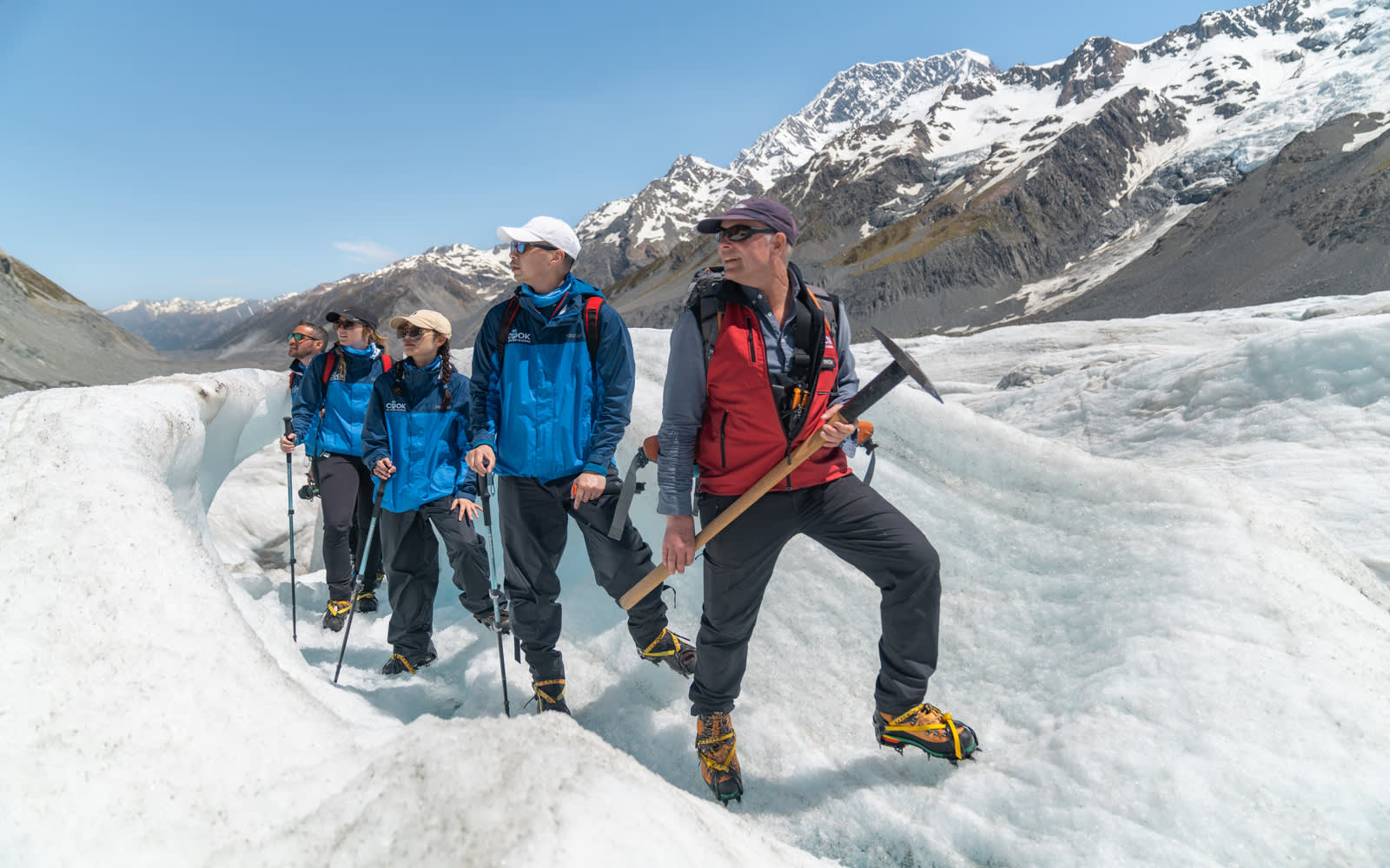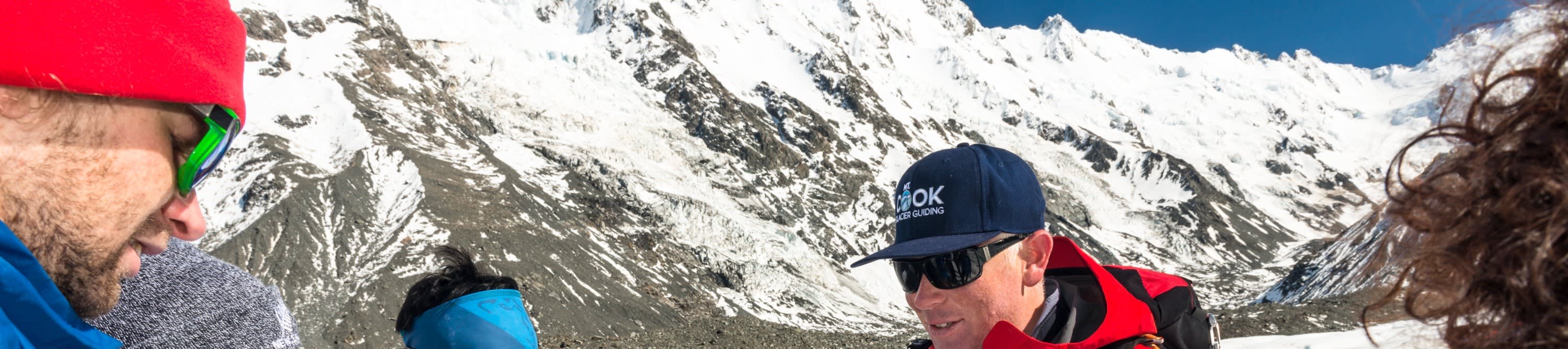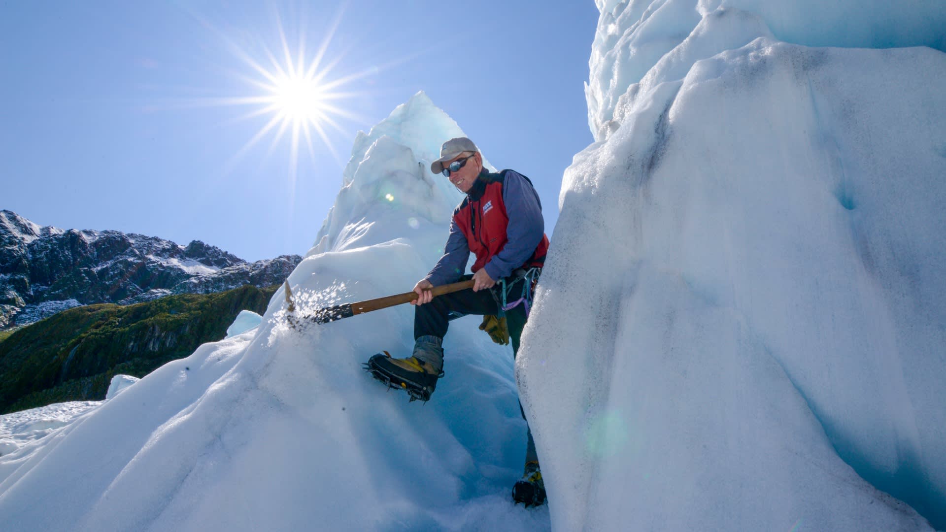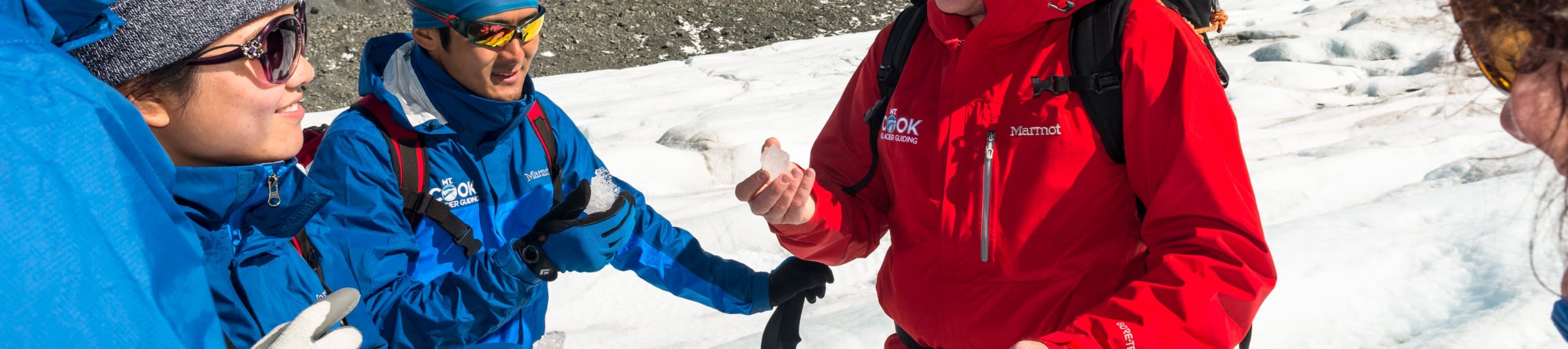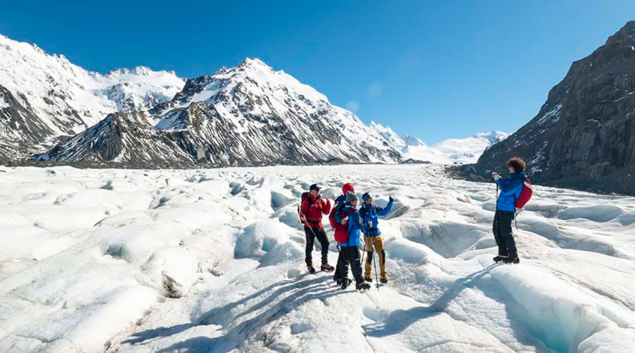 * 뉴질랜드 산악 개척자들로부터 전수받은 기술을 사용하여 빙하에 발판을 만드는 가이드의 안내를 따르세요.