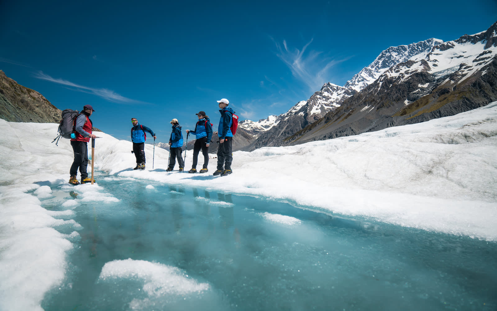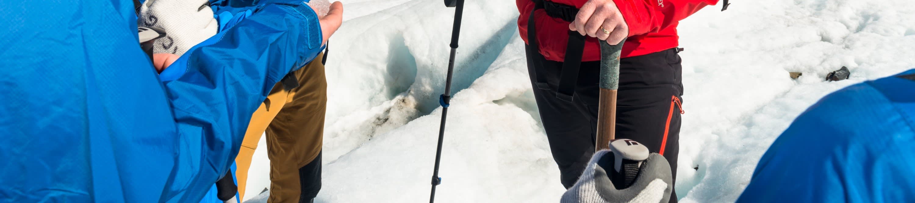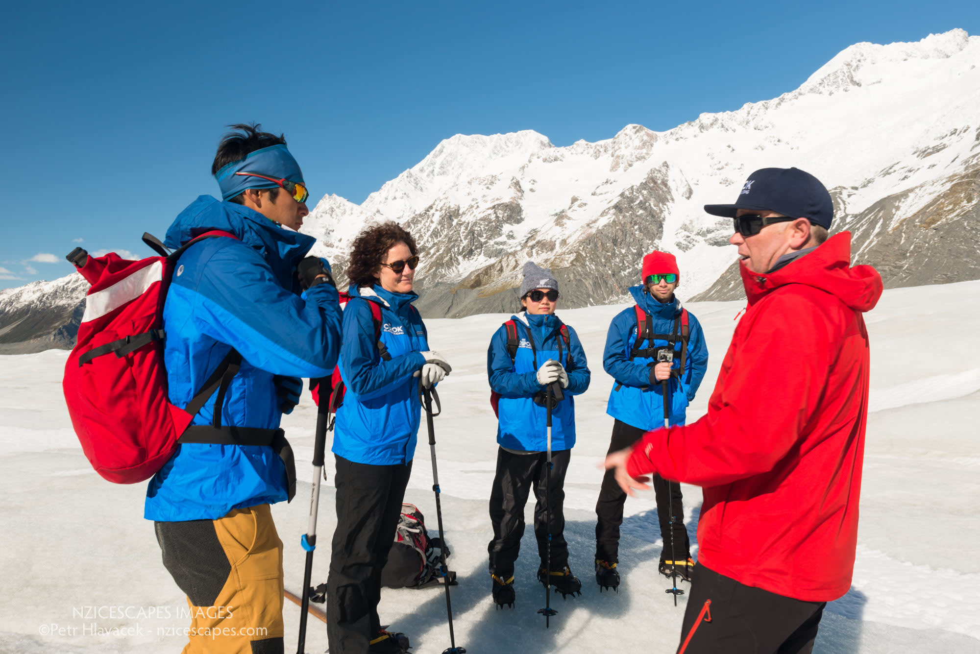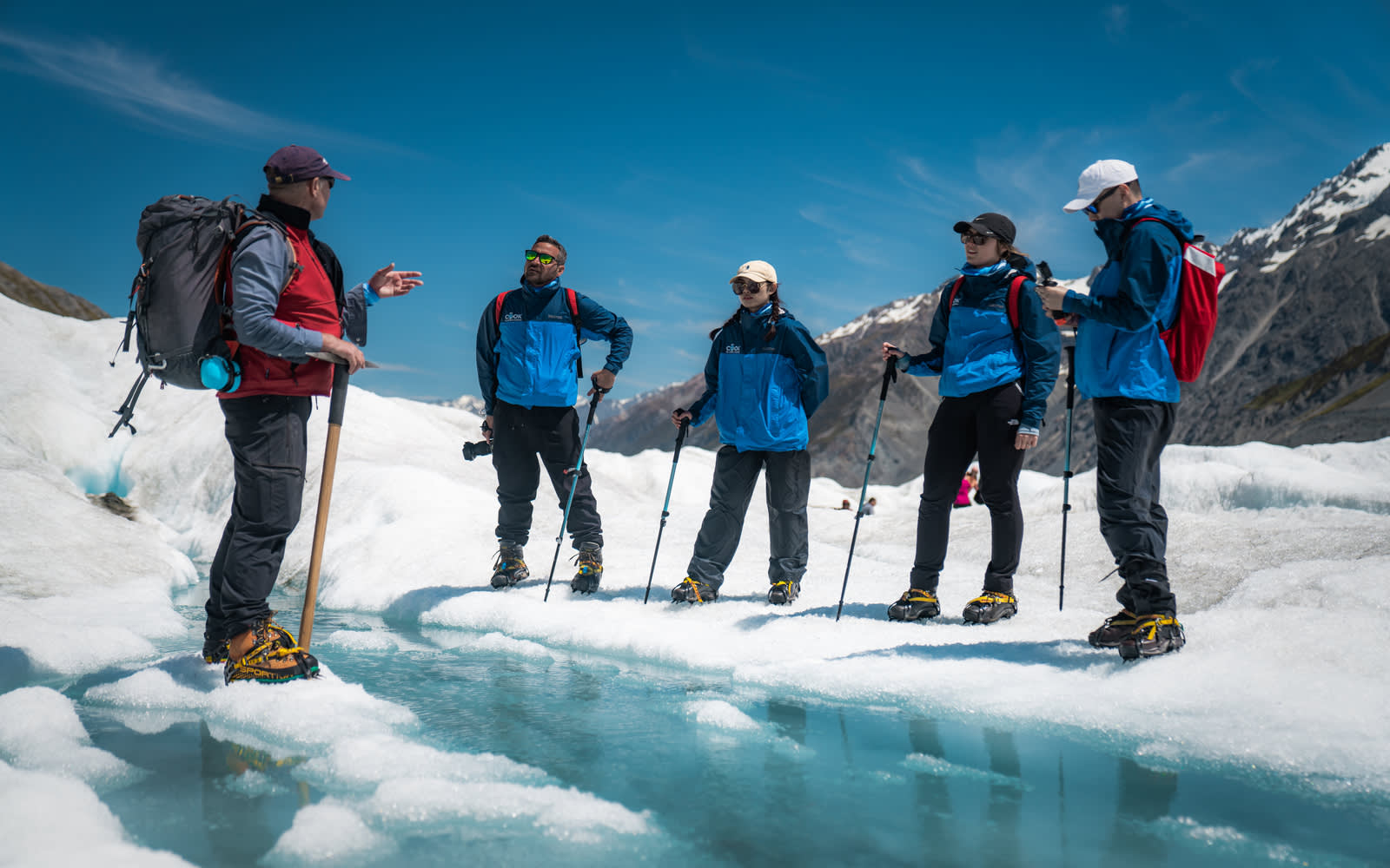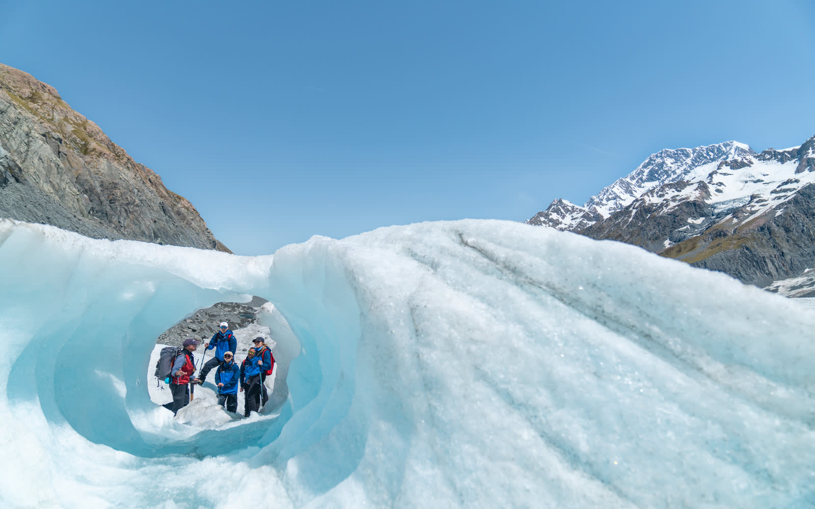 * 뉴질랜드 산악 개척자들로부터 전수받은 기술을 사용하여 빙하에 발판을 만드는 가이드의 안내를 따르세요.