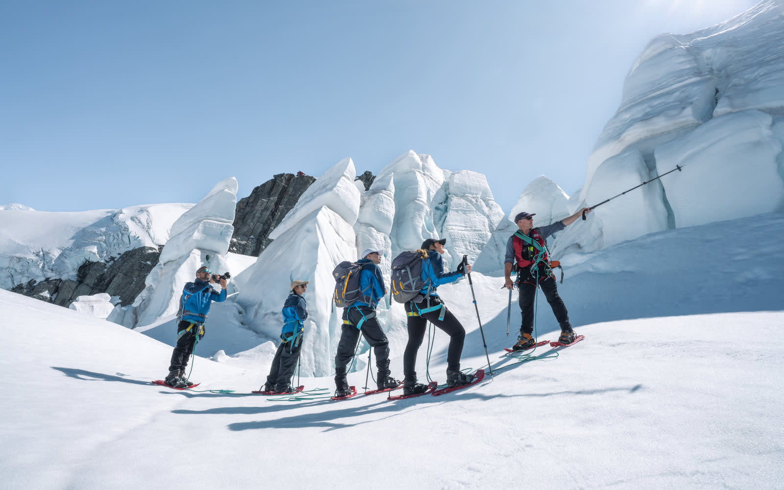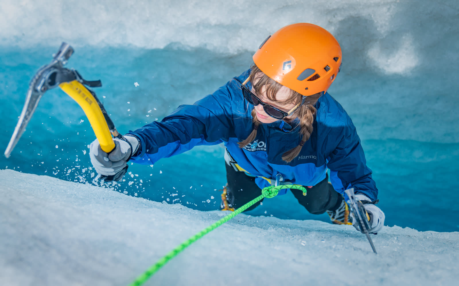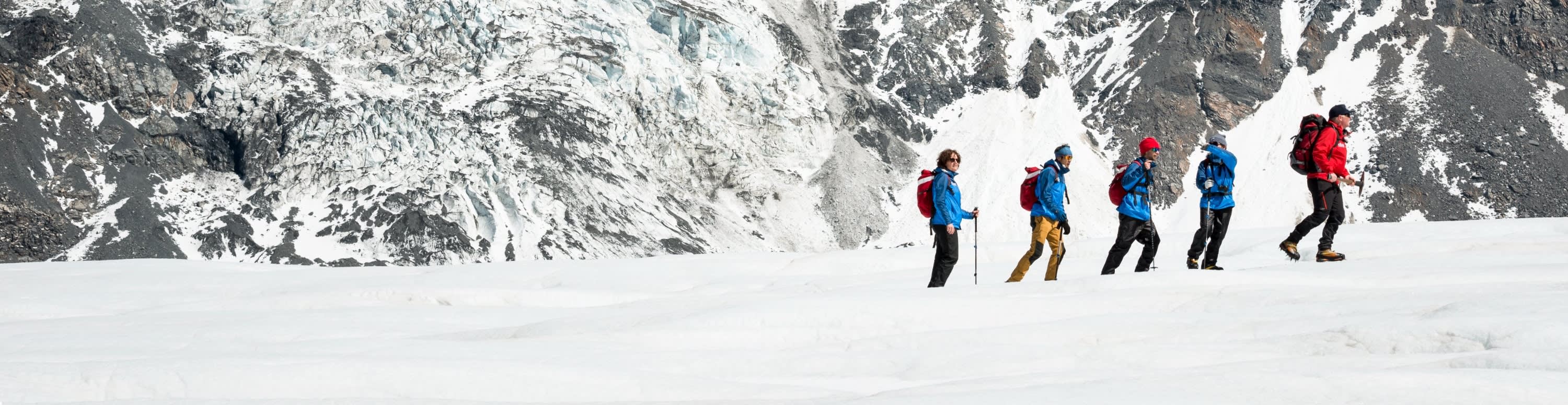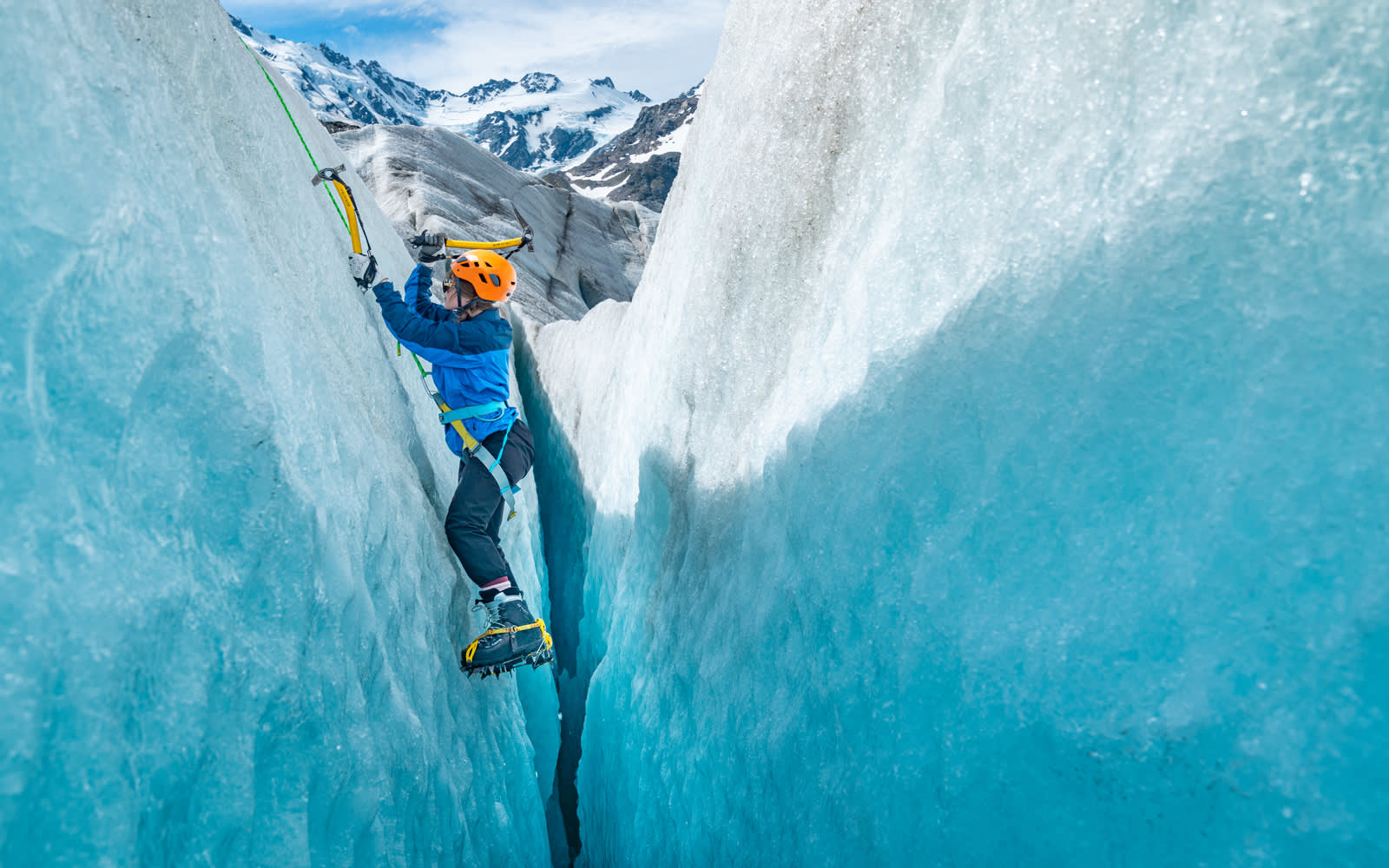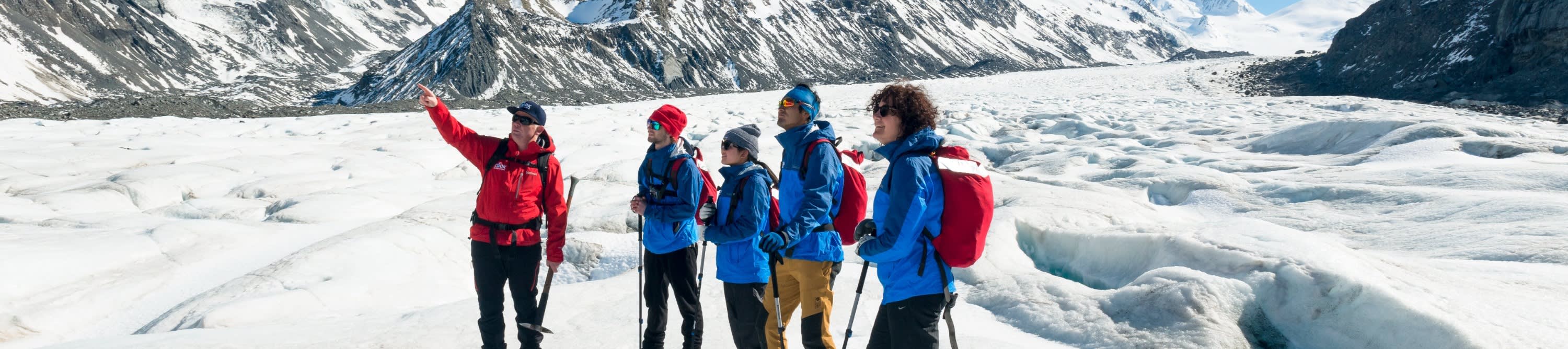 * 뉴질랜드 산악 개척자들로부터 전수받은 기술을 사용하여 빙하에 발판을 만드는 가이드의 안내를 따르세요.