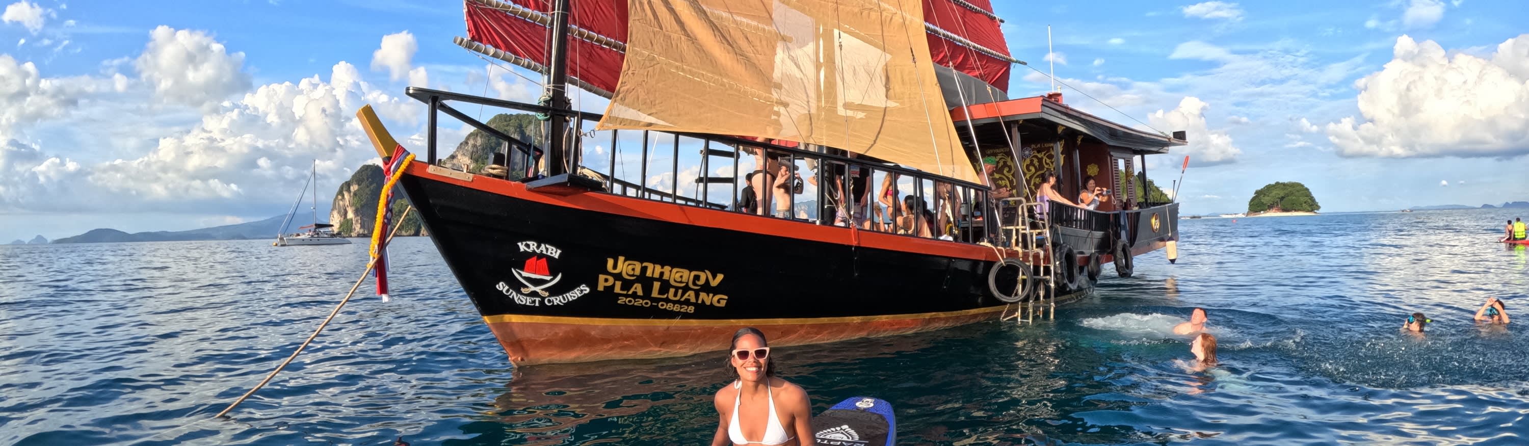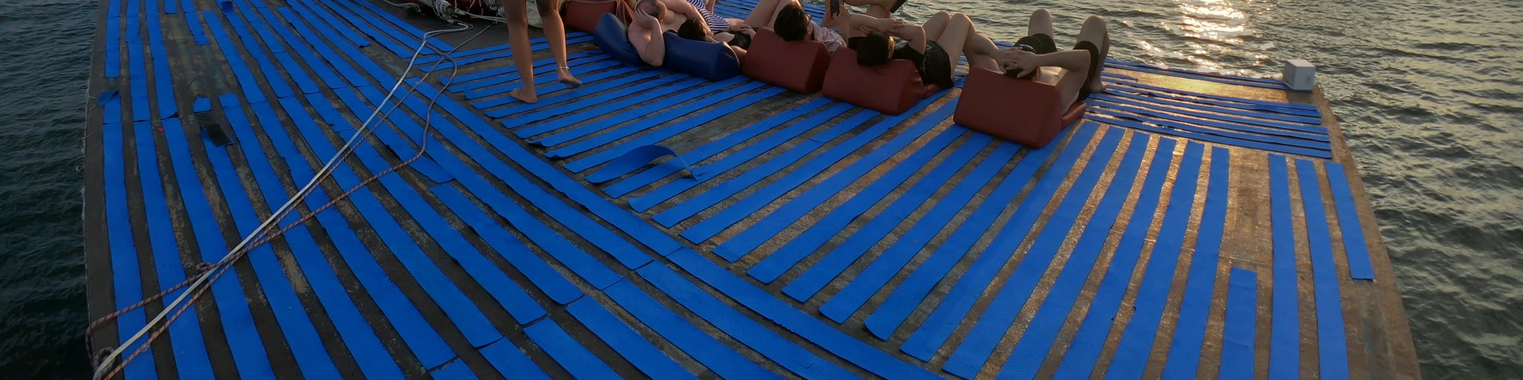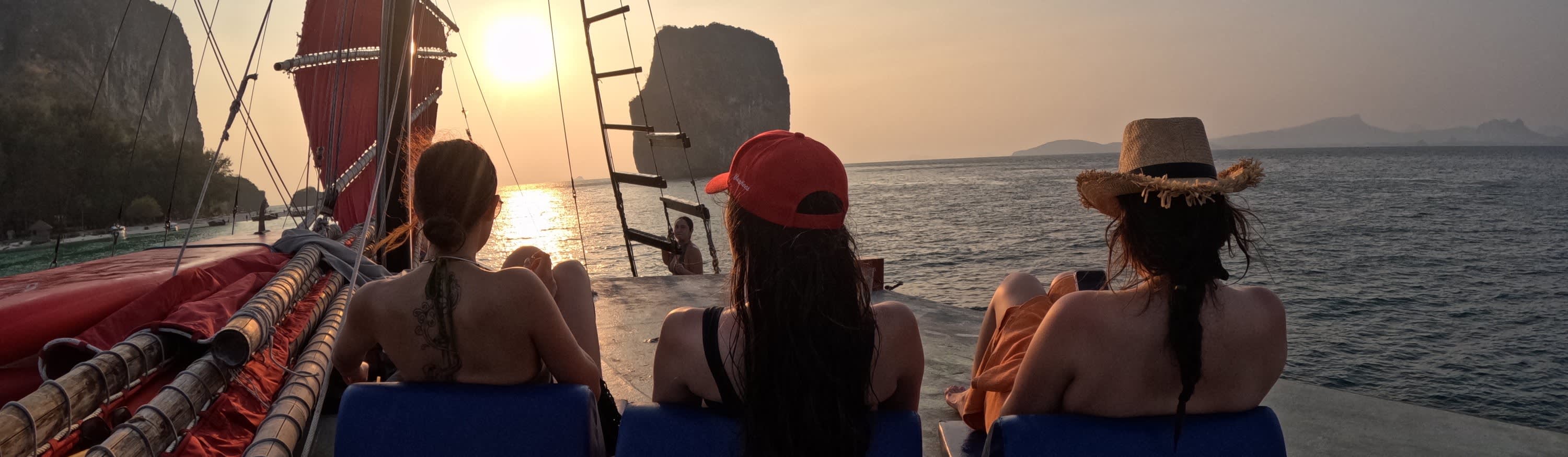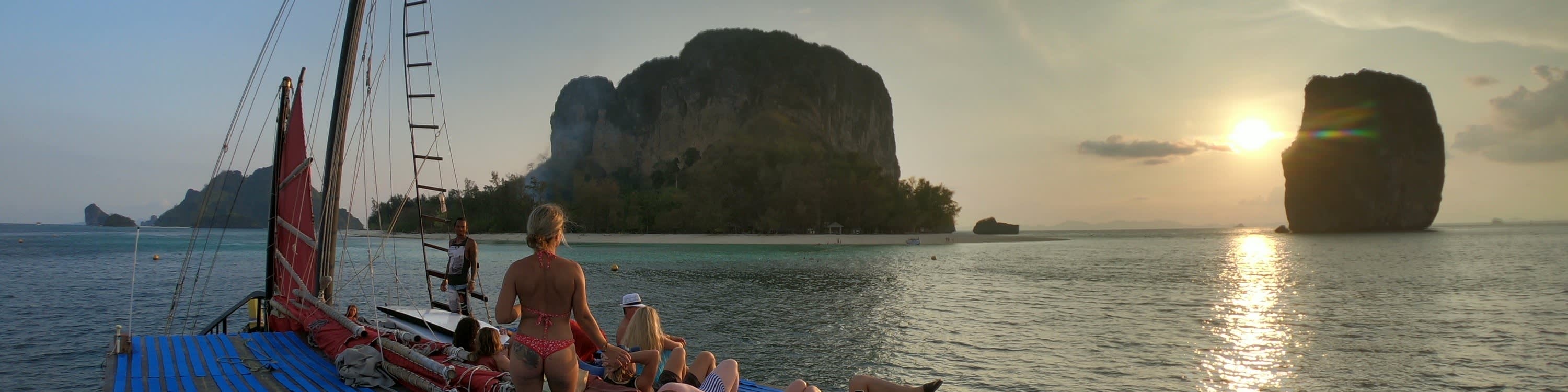 안다만해에서 잊지 못할 하루를 보낼 수 있는 4 Island 선셋 크루즈에 참여하세요. 코 야 와 삼(Koh Ya Wa Sam)의 활기 넘치는 산호초에서 스노클링을 즐긴 후, 치킨 아일랜드(Chicken Island)로 이동하여 수영과 해변 방문을 즐겨보세요. 이곳에서 투명한 바닷물에서 패들보드나 카약을 탈 수도 있습니다. 다음으로, 태양이 수평선 아래로 지면서 완벽한 사진 배경을 만들어내는 꼬다 섬(Poda Island)의 하얀 모래사장에서 휴식을 취하세요. 밤이 되면 라일레이(Railay)의 프라낭 동굴 해변(Phra Nang Cave Beach)으로 이동하여 물속에서 별처럼 빛나는 생물 발광 플랑크톤 사이에서 매혹적인 수영을 즐겨보세요. 이 크루즈는 신나는 음악, 모험, 휴식, 그리고 멋진 풍경이 완벽하게 조화를 이루고 있습니다.