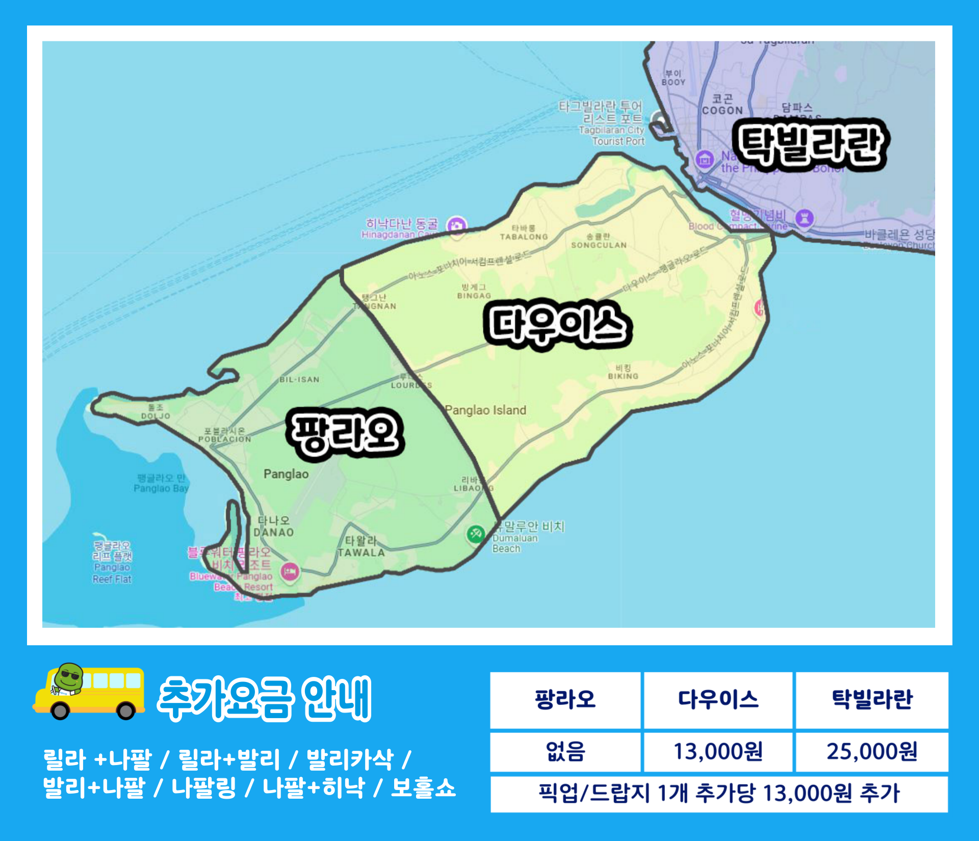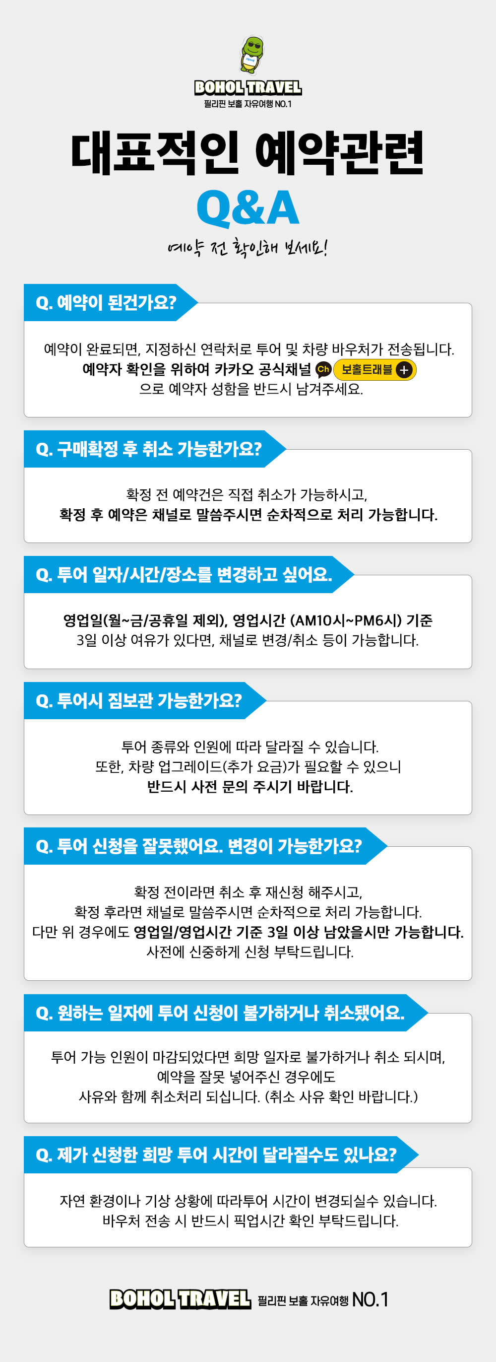 [필독] 투어 공지사항 안내 📌안내사항📌 * 최소 2인부터 투어 진행이 가능합니다. * 스노클 장비 / 고프로 촬영 서비스 포함 상품입니다. 📣꼭 확인해주세요📣 💎예약 안내 - 투어 진행 날짜 희망일 3일 전까지 예약 가능합니다. - 투어관련 및 문의 사항은 보홀트래블 카카오톡 채널 또는 트리플로 문의 주세요! - 투어 픽업시간을 꼭 지켜주세요! - 픽업지와 드랍지를 정확하게 작성 부탁드립니다. - 만4세 이상 성인/아동 요금동일 - 만3세 이하 아동 요금 적용 - 차종 승용차 / SUV / 스몰벤 / 빅벤 → 투어 인원에 따른 배차 - 카시트 제공 불가 - 투어의 픽업 및 투어 안내사항은 전날 오후에 연락드립니다. - 현지 사정에 따라 일정 순서가 변경 될 수 있습니다. - 수중촬영의 경우 간혹 메모리 카드나 고프로 카메라의 이상으로 사진 및 영상이 제대로 저장되지 않는 경우가 있을 수 있습니다. 해당 부분은 해상 투어 이용 시 서비스로 제공해드리는 부분으로, 사진 분실 위험 등 이상이 생길 수 있으니 고프로 SD카드 지참하는 걸 권합니다. (고프로 11과 호환되는 SD카드)