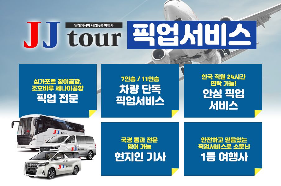 ● 픽업 예약은 원하는 픽업 일정 10일전에 꼭 해주세요. ● 빠듯한 일정에 예약을 원하는 경우 “문의하기”로 문의 주세요. (픽업 가능 여부 확인 후 확정 여부 결정) ● 싱가포르시내, 창이공항 전지역 픽업&샌딩을 해드립니다. ● 조호바루시내 픽업&샌딩 가능 - 시외지역 (세나이공항, 쿨라이자야, 파시구당, 퍼머스자야 등...) - 주 외곽지역 (데사루, 바투바핫, 머르싱 등...) 픽업 비용 별도 문의 주세요. ● 픽업차량은 유아용 시트를 보유하고 있지 않습니다. ● 별도의 추가 요금 / 현지 추가 요금 전혀 없는 올 포함된 단독 픽업 서비스
