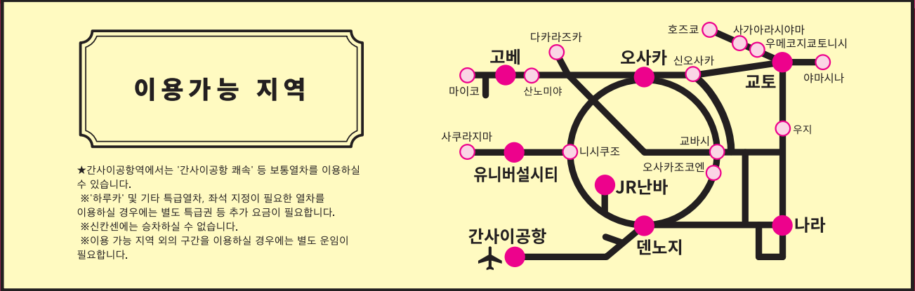 간사이 지역의 핵심코스인 오사카, 교토, 나라, 고베 지역까지의 JR 신쾌속, 쾌속, 보통 열차를 연속 3일간 무제한으로 이용할 수 있습니다.