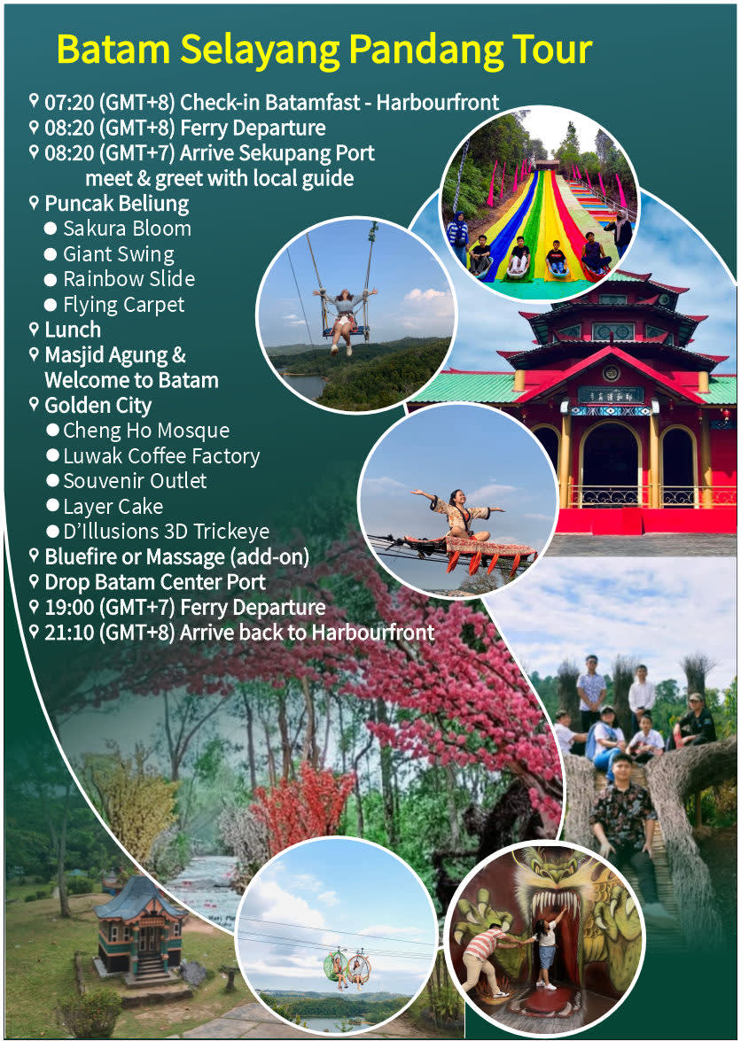 싱가포르에서 페리로 단 1시간 거리에 있는 바탐은 남중국해에 있는 작은 섬으로, 싱가포르에서 당일 여행이나 주말 여행을 즐기려는 사람들에게 안성맞춤입니다. 바탐 기념비 'Welcome to Batam'에서 사진을 찍고 바탐의 명물인 겹겹이 쌓인 케이크, kueh lapis를 맛보세요. 점심 식사로는 Barelang Seafood Restaurant에서 맛있는 해산물 요리를 즐겨보세요. 골든 시티로 이동하여 고카트나 플라잉 폭스를 즐길 수도 있습니다. Polo, Batik, First Factory Outlets, Grand Batam Mall에서 쇼핑을 즐기며 기념품을 구입해 보세요.