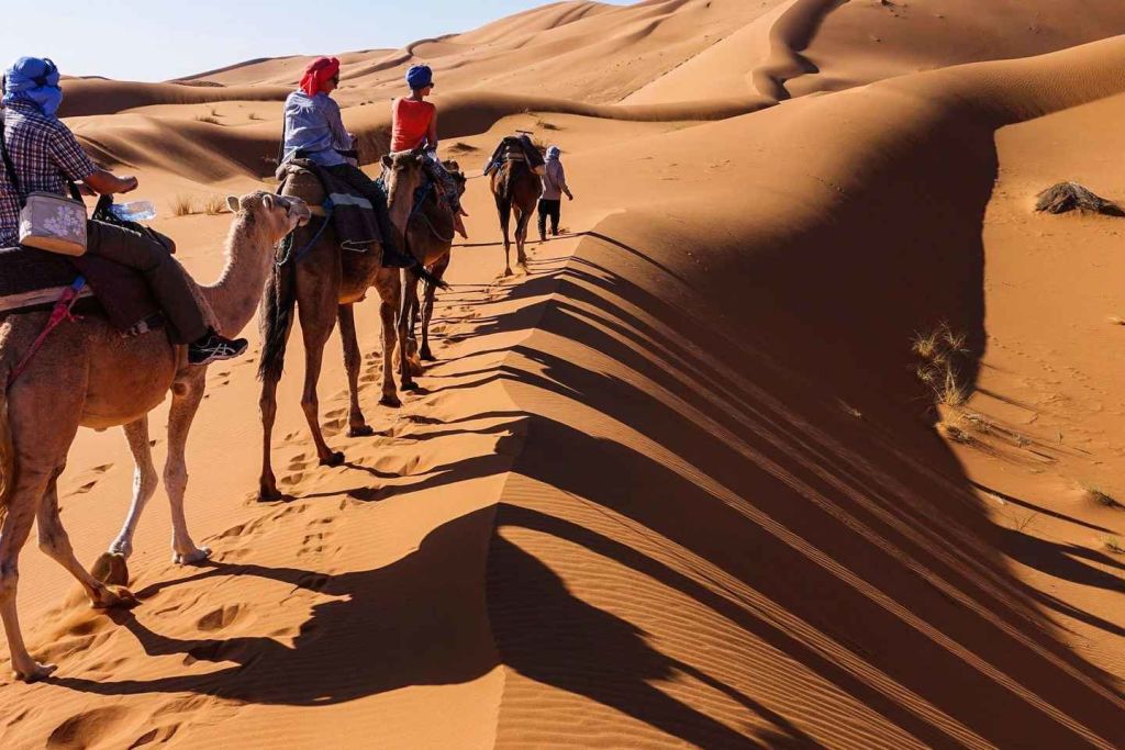 하루가 끝나면 사막 한가운데서 낙타 타기를하며 모래 언덕의 360 ° 전망을 감상하고 멋진 순간 인 일몰을 감상 할 수 있습니다.