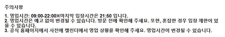• 자세한 영업시간, 휴관일, 유효기간에 대한 정보는 공식 사이트와 각 시설의 홈페이지에서 방문 전 다음 링크를 참고해 주세요.