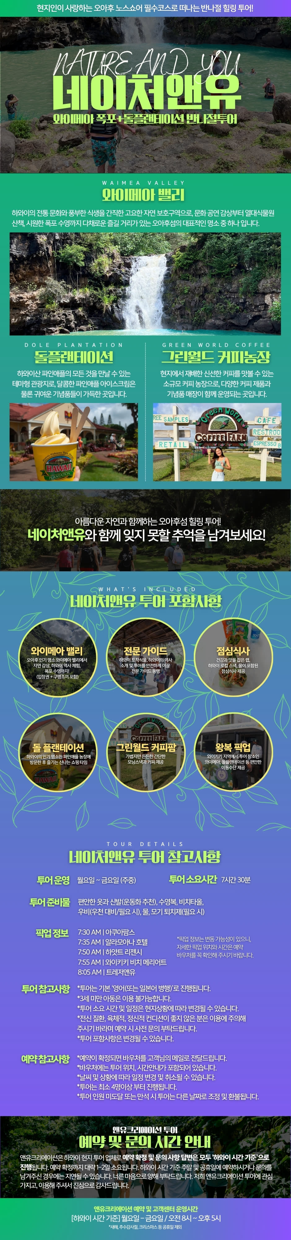 - 투어 일정은 날씨, 교통, 휴일에 따라 변경될 수 있습니다. - 준비물: 편안한 옷과 신발, 우비(우천 대비), 물, 수영복, 비치타올 - 와이메아 폭포 상황에 따라 수영 액티비티가 제한될 수 있습니다. - 3세 미만 아동은 이용 불가능합니다. - 전신 질환, 육체적, 정신적 컨디션이 좋지 않은 분은 이용에 주의해주시기 바라며 예약 시 문의 해주셔야 합니다. - 와이메아 밸리 하이킹 난이도는 '쉬움'입니다. - 투어 당일 투어 불가능한 날씨이거나, 최소 4명을 모객하지 못한 경우 투어 변경 및 환불이 이루어질 수 있습니다. - 모객인원: 최소 4명, 최대 23명 - 투어 일정은 날씨, 교통, 휴일 및 지형 조건 및 기타 상황에 따라 변경될 수 있습니다. - 본 투어 참여를 위해서는 현지 규정에 따른 책임 면책 및 안전 관련 서약서(waiver) 작성이 필수입니다. 해당 서약서는 예약 확정 후 이메일 또는 메시지를 통해 전달되며, 서약서 미작성 또는 동의 거부 시 투어 참여가 불가합니다.