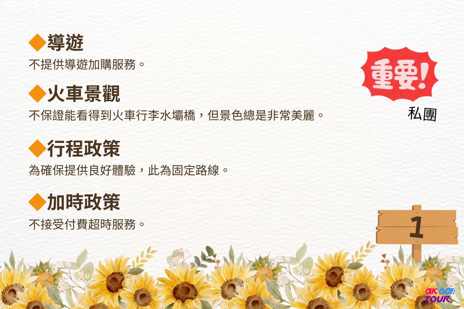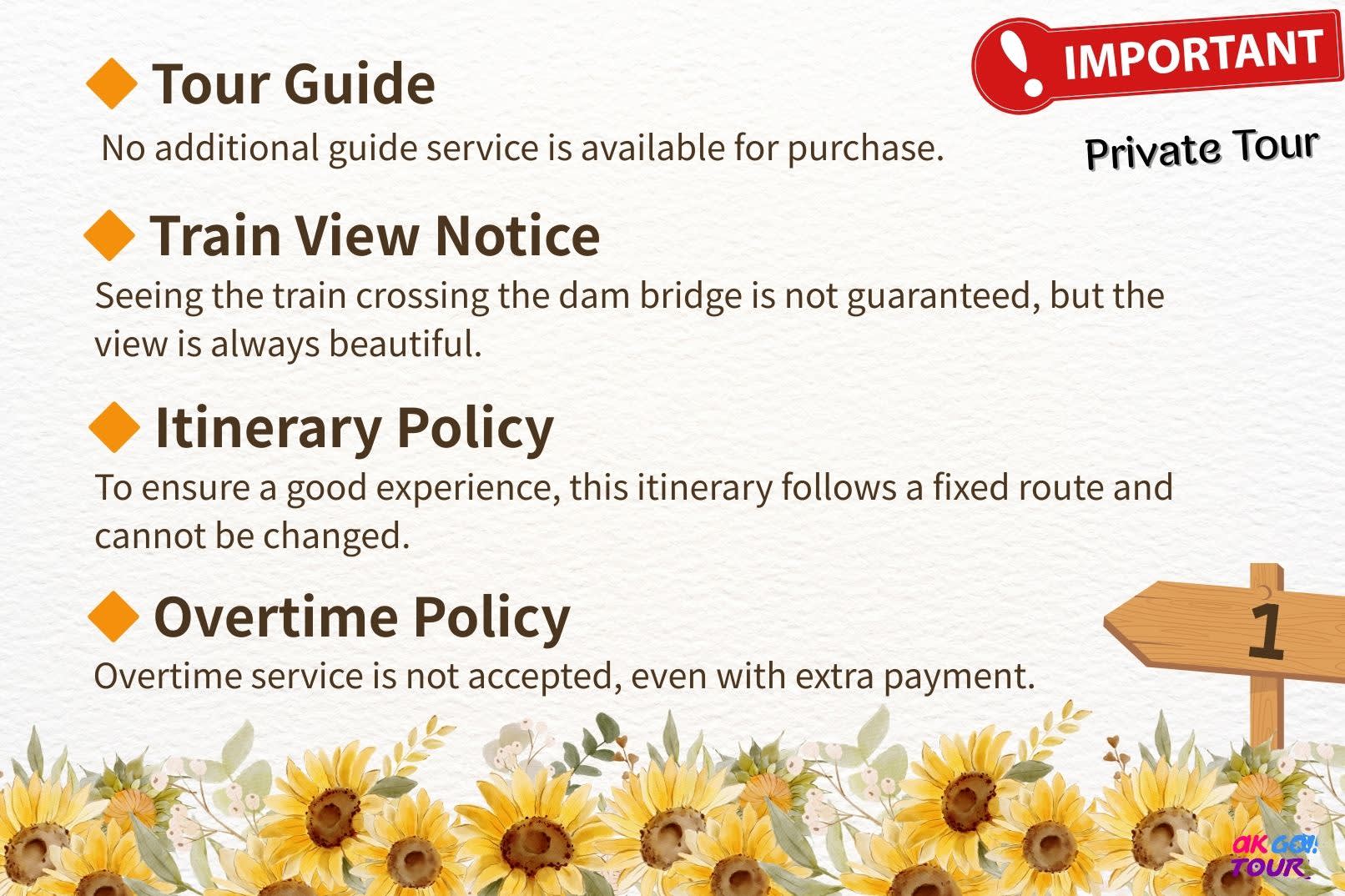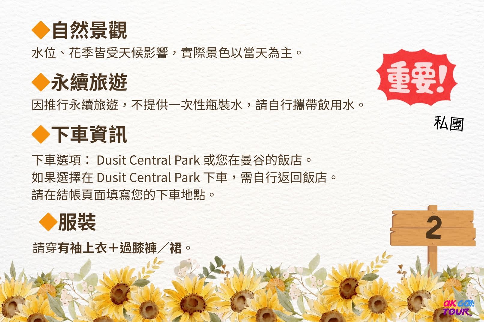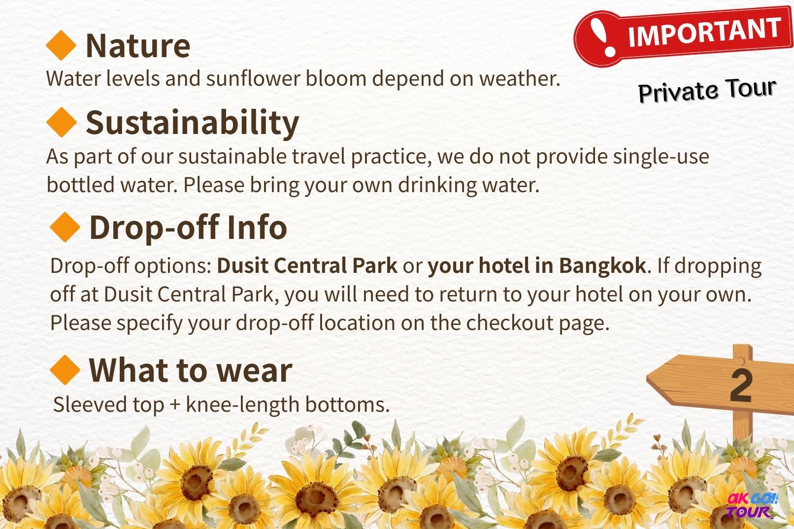 ▶Ayutthaya & Sunflower Field Heritage Private Full-Day Tour - Additional information - Other Reminders * Tour Guide :No additional guide service is available for purchase. * Train View Notice :Seeing the train crossing the dam bridge is not guaranteed, but the view is always beautiful. * Itinerary Policy :To ensure a good experience, this itinerary follows a fixed route and cannot be changed. * Overtime Policy :Overtime service is not accepted, even with extra payment. * Nature : Water levels and sunflower bloom depend on weather. * Sustainability : As part of our sustainable travel practice, we do not provide single-use bottled water. Please bring your own drinking water. * Drop-off Info : Drop-off options: Dusit Central Park or your hotel in Bangkok. If dropping off at Dusit Central Park, you will need to return to your hotel on your own. Please specify your drop-off location on the checkout page. - Prohibitions & Limitations * Participants are advised dress appropriately for this activity (long pants, long-sleeved shirt or scarf to cover shoulders, and closed shoes) * Please dress accordingly depending on the day's weather conditions * For smooth entry, please refrain from wearing flip flops, shorts, tank tops, or sleeveless shirts - What to bring * Sunscreen / Sunglasses / Caps or hats / Cash - Accessibility * Important: Infants and children must be included in the passenger headcount * Child seats are available upon request (Only 1 child seat is free) * This activity is stroller-friendly * This activity is not wheelchair-accessible - Eligibility * This activity has no age limit * Important: Infants and children must be included in the passenger headcount * The child safety seat: It is good for children aged 0-6 under 135 cm. It's with a limited quota on a first come first serve. To request the second or more child safety seat you need to pay an additional 200 THB each. The operator will contact customer back to inform of payment child seat.