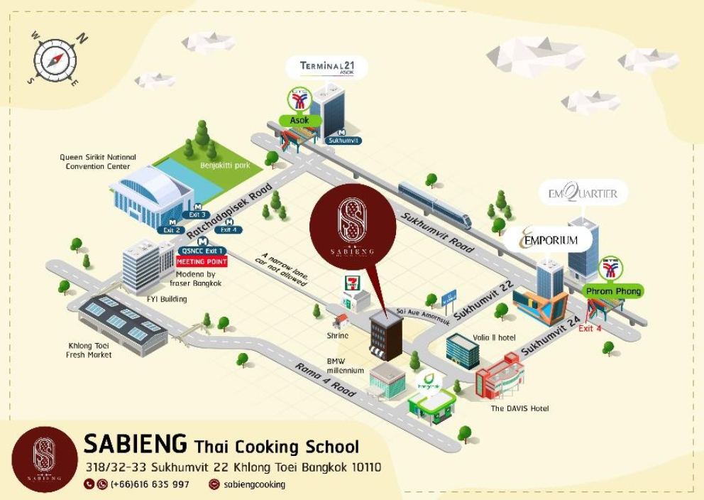 ▶ 주의사항 - 주의 및 참고사항 해당 쿠킹은 픽업 서비스가 제공되지 않아 오전, 오후 클래스 모두 미팅 포인트로 직접 이동 하셔야 합니다. 1시간 이상 늦는 경우 노쇼로 처리되며 환불, 변경이 일체 되지 않습니다. 마켓 투어 미팅 시간 이후 도착 시 마켓 투어에 참여할 수 없습니다. 미팅 시간에 도착하지 못한 분들은 쿠킹스쿨로 직접 이동해 주세요. 쿠킹스쿨 대중교통으로 직접 이동시 MRT - QSNCC 1번 출구에서 도보로 15분 또는 바이크 탑승후 Soi Aue Amorn Suk BTS - Phrom Phong 4번 출구에서 도보로 20분 또는 바이크 탑승후 Soi Aue Amorn Suk 쿠킹스쿨 주소 Sabieng Thai Cooking School 318 32-33 Soi Sukhumvit 22, Khlong Toei, Bangkok 10110 061 663 5997 ▶ 아동 정책 영아 (0~3세) : 무료 유아 (4~7세) : 아동요금 아동 (8세이상) : 성인요금 쿠킹클래스에 미 참여시 참관인으로 1인 당 1,000바트 참관 가능합니다. (참가자 1인당 1 참관인 가능, 성인/아동 요금 동일) 동행하는 참가자에게 물, 과일 또는 추가재료를 제공합니다.