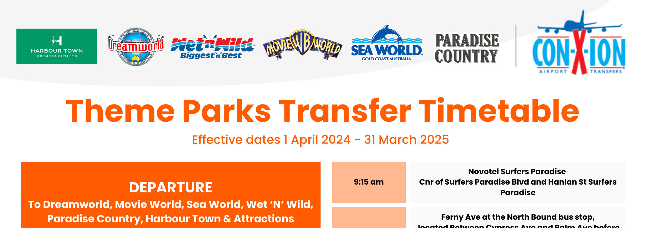 테마파크 픽업/샌딩 장소 • 하버 타운 – 하버 타운 내 관광 라운지에서 픽업/샌딩합니다. • Wet ‘n’ Wild – 버스 정류장에서 픽업/샌딩합니다. • 파라다이스 컨트리 - 버스 정류장에서 픽업/샌딩합니다. • 무비 월드 – 관광버스 주차장에서 픽업/샌딩합니다. • 드림 월드/화이트 워터 월드 – 버스 주차장(주차장 구역 입구에서 왼쪽에 위치, Buzz Saw 놀이기구 앞)에서 픽업/샌딩합니다.