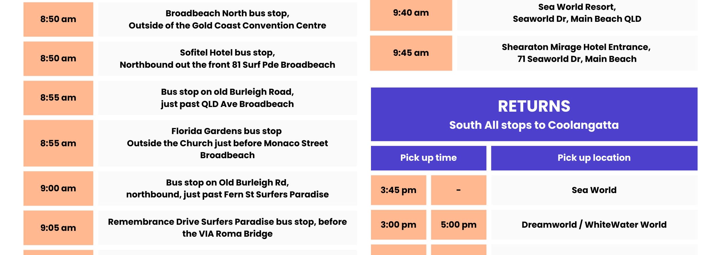 탑승하는 모든 승객에게 테마파크 출발 시간이 기재된 "리턴" 가 제공됩니다. 승객은 픽업 예정 시간 10분 전에 지정된 픽업 장소에서 대기해야 합니다. 시간표에 기재된 시간은 테마파크에서 버스 출발 시간을 나타냅니다.
