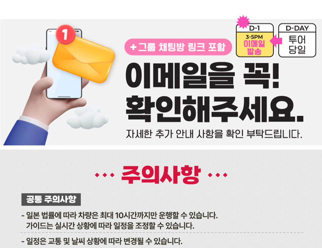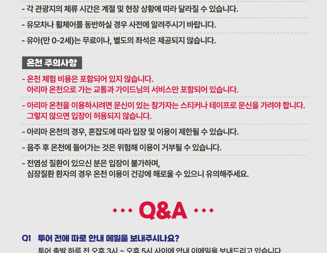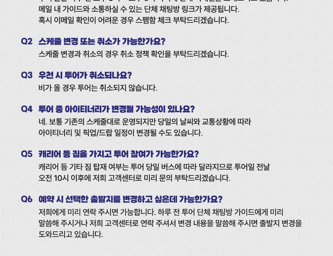 * Q1) 투어 전에 알림이나 미리 알림을 받을 수 있나요? 출발 하루 전 오후 3시부터 5시 사이에 알림 이메일을 보내드립니다. 이 이메일에는 투어 직원과 직접 소통할 수 있는 그룹 채팅 링크가 포함되어 있습니다. 이메일을 찾을 수 없는 경우 스팸 또는 정크 메일함을 확인해 주세요. * Q2) 투어 날짜를 변경/취소하고 싶습니다. 가능한가요? 일정 변경 또는 취소에 관해서는 취소 정책을 참조해 주세요. * Q3) 내일 비가 온다고 들었습니다. 투어가 취소되나요? 비가 오는 날씨로 인해 투어가 취소되지는 않습니다. * Q4) 투어 중 일정이 변경될 가능성이 있나요? 네. 일정 및 픽업/드롭오프 시간은 현장 교통 및 날씨 상황에 따라 달라질 수 있습니다. * Q5) 수하물을 가져갈 수 있나요? 수하물 반입은 투어 당일 버스 크기에 따라 달라지므로 고객 서비스팀에 문의해 주세요. 투어 하루 전 한국 시간 오전 10시 이후에 문의하시는 것을 권장합니다. * Q6) 미팅 장소를 변경하고 싶습니다. 어떻게 해야 하나요? 투어 가이드에게 투어 버스를 만나고 싶은 장소를 알려주세요. 또는 투어스토리에 연락하여 미팅 장소 변경을 요청할 수 있습니다.