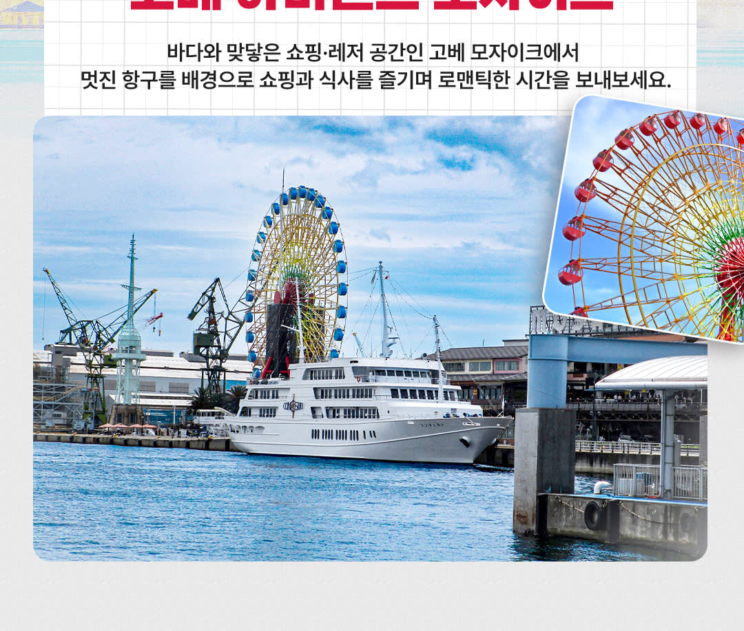 마지막으로 활기찬 해변 쇼핑 및 다이닝 단지인 고베 모자이크에서 하루를 마무리하세요. 이 투어는 최고의 고베 당일 여행을 위해 경험, 휴식, 문화 및 풍경을 결합합니다.