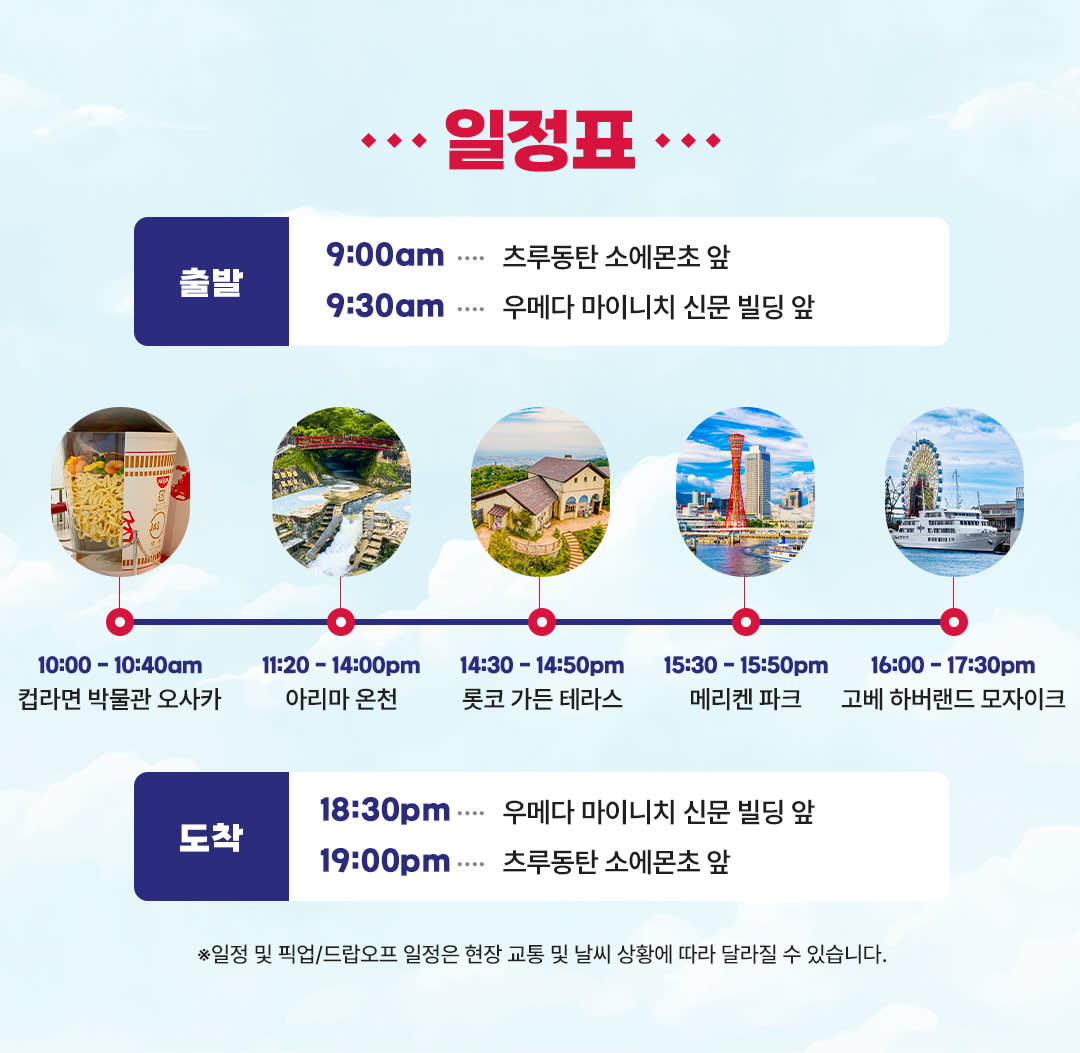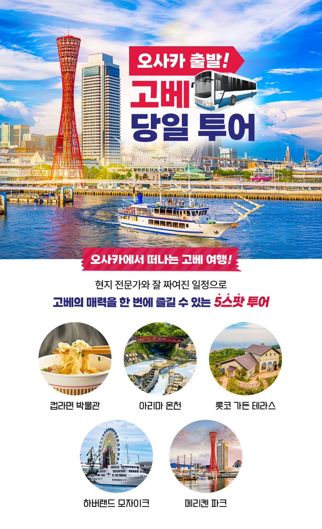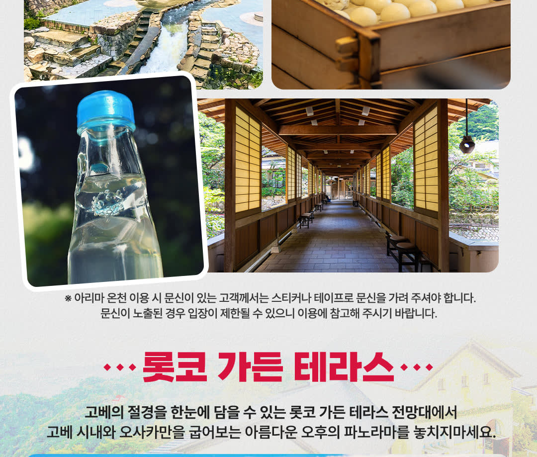 ▶컵누들 뮤지엄 + 아리마 온천 + 롯코 가든 테라스 + 메리켄 파크 + 모자이크 - 이용요건 * 본 상품은 이용 가능 연령이 제한되어 있지 않습니다. * 만 0-2세는 별도의 좌석이 필요하지 않은 경우 무료입니다. * 그룹 규모: 참여자 수 1-49인 - 추가정보 * 출발 전날 15:00-17:00 사이에 투어 운영업체에서 단체 채팅방 링크가 포함된 알림 이메일을 보내드립니다. 단체 채팅방에서 투어 담당자와 직접 소통하실 수 있습니다. 이메일을 찾을 수 없는 경우 스팸 메일함을 확인해 주세요. * 일본 법규에 따라 차량은 10시간 이상 운행할 수 없습니다. 투어 가이드가 실시간 상황에 따라 일정을 조정할 수 있습니다. * 교통 및 기상 상황에 따라 일정이 변경될 수 있습니다. * 각 스팟의 체류 시간은 계절 및 현장 상황에 따라 달라질 수 있습니다. * 수하물 또는 유모차 반입은 투어 당일 버스 크기에 따라 달라지므로 고객센터로 문의하시기 바랍니다. 투어 출발 전날 오전 10:00 (KST) 이후에 투어 업체에 문의하시는 것을 권장합니다. * 온천 이용 요금은 포함되어 있지 않습니다. 본 투어에는 아리마 온천까지의 교통편과 가이드 서비스만 포함됩니다. * 온천 이용 시, 문신이 있는 분은 스티커나 테이프로 문신을 가려야 합니다. 그렇지 않으면 입장이 불가합니다. * 혼잡도에 따라 아리 온천의 입장 및 이용이 제한될 수 있습니다. * 만취한 여행객은 온천 이용이 거부될 수 있습니다. * 전염병이 있는 여행객은 시설 입장이 불가합니다. 온천 이용은 심장 질환이 있는 고객의 건강에 해로울 수 있으니 유의하시기 바랍니다. * 참고: 단체 투어의 특성상 다른 언어를 사용하는 여행객과 동행할 수 있습니다. 이 점 양해 부탁드립니다. - 규정 및 제한사항 * 본 액티비티는 고혈압, 간질 등의 의학적 질환을 앓고 계신 분에게는 권장하지 않습니다. - 편의성/접근성 * 유모차 이용이 가능합니다. * 휠체어 이용이 불가합니다.