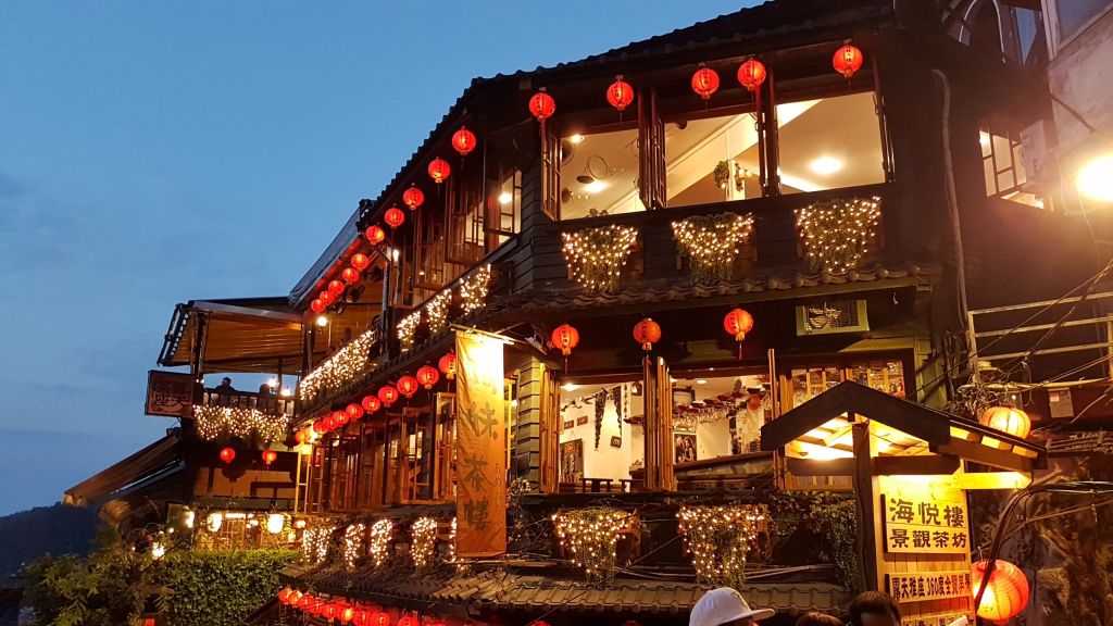 센과 치히로 애니메이션으로 유명한 아메이 찻집의 야경 사진과 한국 여행객들이 많이 구매해서 가져가는 펑리수, 누가 크래커, 망고 젤리, 대만의 아리산 우롱차 등을 시식하거나 구매할 수 있는 대만의 옛 거리