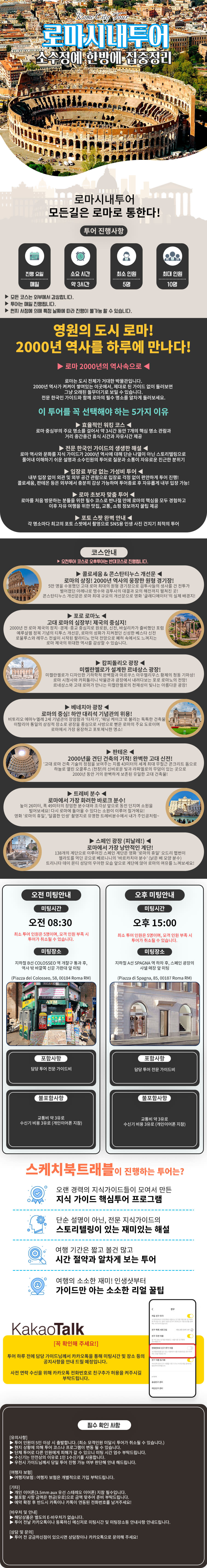 ✨ 로마 반나절 투어: 로마를 한 방에 정복하세요! ✨ 로마를 제대로 느끼고 싶다면, 노련한 가이드와 함께하세요! 복잡한 로마 시내를 최적의 코스로 효율적으로 둘러보며, 서양사의 중심이자 사랑이 숨 쉬는 도시의 진정한 매력을 알려드립니다. 체력 소모는 최소화하고, 숨겨진 포토 스폿에서 인생 사진도 남겨보세요. 투어 후에는 현지인이 사랑하는 맛집과 쇼핑 정보까지 얻어 가실 수 있습니다. ✅투어 포함 & 불포함 사항 (포함) * 전문 가이드 비용 (불포함) * 교통비: 약 3유로 * 수신기: 3유로 (개인 이어폰 지참 필수) * 개인 식사비, 입장료 등 ⏰이용 안내 및 필수 확인 사항 * 미팅 시간 및 장소: * 오전 투어 (08:30~12:00): 지하철 B선 COLOSSEO 역 신문 가판대 앞 * 오후 투어 (15:00~18:30): 지하철 A선 SPAGNA 역 샤넬 매장 앞 * 최소 출발 인원: 5명 (모객 부족 시 투어 취소) 필수 준비물 * 개인 이어폰 (3.5mm Aux 유선) 지참 필수 (미지참 시 구매 가능) * 불포함 금액을 지불할 현금(유로) * 여름철에는 선크림과 선글라스 지참 유의 사항 * 투어는 우천 시에도 정상 진행됩니다. * 매주 토, 일요일은 미사로 인해 판테온 내부 입장이 불가능합니다. * 단체 투어이므로 미팅 시간 엄수 부탁드립니다. * 예약 후 현지에서 연락 가능한 카카오톡 ID를 꼭 남겨주세요. 기타 안전을 위해 여행자 보험에 개별적으로 가입하시길 권장합니다. 본 상품은 별도의 E-바우처가 없으며, 투어 전날 카카오톡으로 안내 사항이 전달됩니다. ❌취소 및 환불 규정 (현지 시각 기준) * 여행시작 30일 전까지 (~30) 통보시 : 여행 요금 전액 환불 * 여행시작 20일 전까지 (29~20) 통보시 : 상품 요금의 20% 공제 * 여행시작 7일 전까지 (19~7) 통보시 :상품 요금의 30% 공제 * 여행시작 4일 전까지 (6~4) 통보시 :상품 요금의 50%공제 * 여행시작 당일까지 (3~당일) 통보시 : 취소/환불 불가 ※ 여행일은 현지 시각 기준입니다.