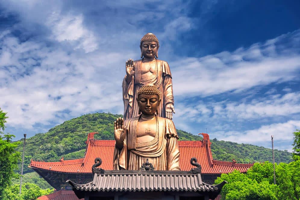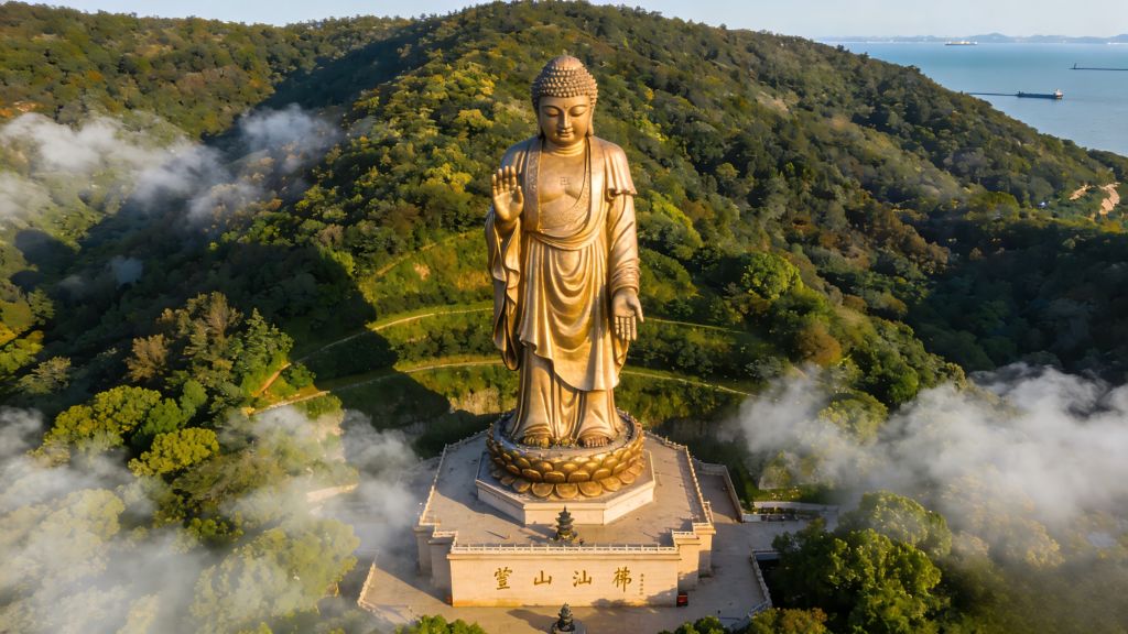 🏞️【주요 관광 명소 소개】 🏯 링산 대불 링산 대불은 우시 링산 성지의 상징적인 경관으로, 높이가 88m에 달하며 세계에서 가장 높은 노천 청동 석가모니 불상입니다. 웅장하게 태호 호반에 자리 잡고 있으며, 오른손은 '두려움 없음을 베푸는 손 모양'으로 중생의 고통을 없애주고 왼손은 '소원 성취를 기원하는 손 모양'으로 기쁨을 주겠다는 의미를 담고 있습니다.