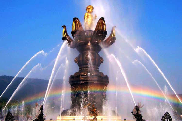 🌊 구룡관욕 이곳은 링산 대불 앞 광장에 위치한 대형 음악 동적 청동 조각군으로, 불교 경전에서 석가모니가 탄생했을 때 '아홉 마리 용이 물을 뿜어' 목욕을 시켰다는 고사에서 아이디어를 얻었습니다. 공연이 시작되면 거대한 연꽃 동 조각이 음악에 맞춰 서서히 피어나고, 높이 7.2m의 금박 입힌 태자 불상이 그 안에서 솟아오릅니다. 주변의 아홉 마리 거대한 용이 입에서 수십 미터 높이의 물줄기를 뿜어내 화려한 물의 장막을 형성하여 매우 장관을 이룹니다.