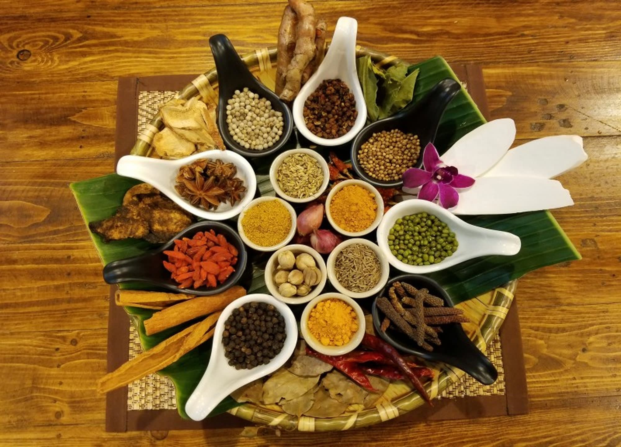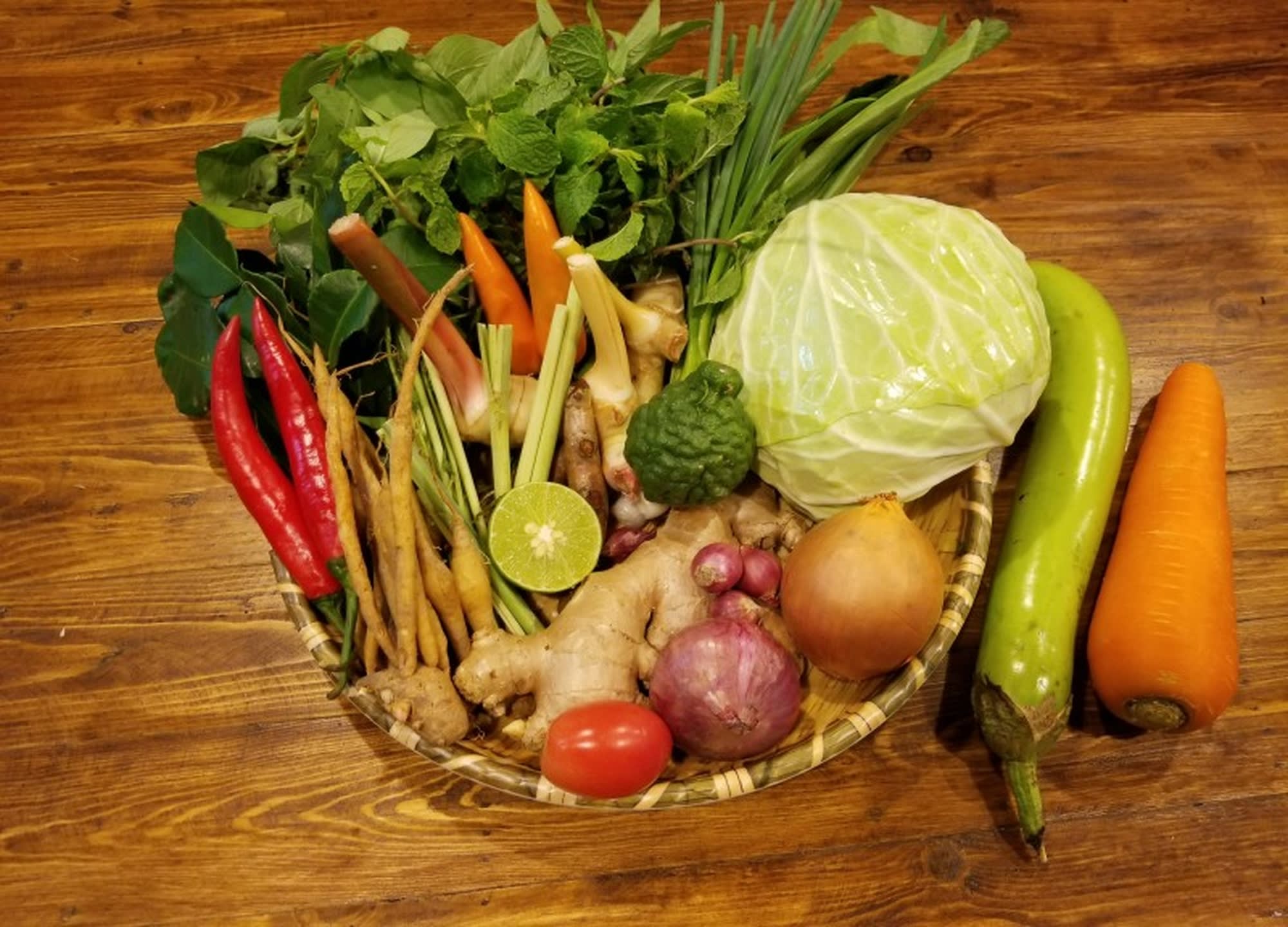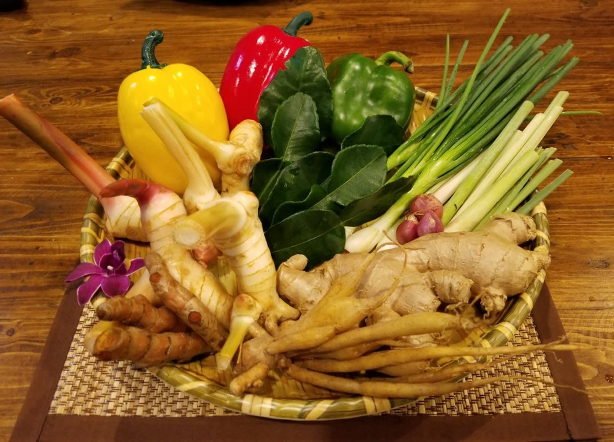 정통 태국 음식에 사용되는 전통 과일, 허브, 야채 및 향신료부터