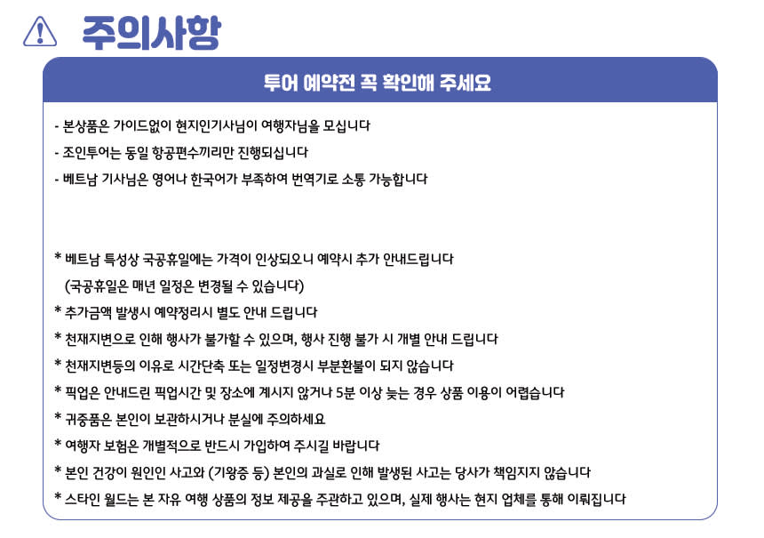 ✅ 예약안내 1. 결제 및 예약 완료 2. 스타인월드에서 개별 메시지 발송 3. 메시지에서 안내 받은 신청서를 통해 상세 투어 내용 전달 4. 상세 투어 일정 확정 및 안내 5. 스타인월드 직영으로 바우처가 필요 없으며 확정한 일정에 맞춰서 행사 진행 (투어 전날 현지 투어 안내문 발송함) 본 상품은 예약이 진행되는 상품이며 최종 확정 안내는 채널톡 연결 후 개별 안내드립니다 연결이 안될시 예약상품은 취소될 수 있습니다 채널톡 : 스타인월드_다낭 [한국 스타인월드 근무시간] * 취소 접수 기준 : 영업일 기준 평일 오전 10:00 ~18:00(주말&공휴일 제외) * 운영시간 이후 접수 건은 다음 영업일 기준으로 적용됩니다. - 개별 여행자 보험에 가입을 권장드립니다. - 본 상품은 고객 결제 후 해피콜/해피톡 때 여행 출발에 대한 최종 확정 여부를 결정하며,출발 확정 이후 취소 시, 귀책사유에 따라 약관에 따릅니다. 구매 전, 약관 내용을 반드시 숙지하셔서 신중한 구매 부탁드립니다. - 최소 출발인원 미 충족 시 여행표준약관 제9조에 따라 여행사는 여행출발 2일 전까지 여행계약을 일방적으로 해제하고 소비자에게 통보할 수 있습니다. 여행 참가자 수의 미달로 여행개시 2일전까지 여행계약 해지 통보 시 여행신청금은 전액 환급 또는 날짜변경으로 안내드립니다.