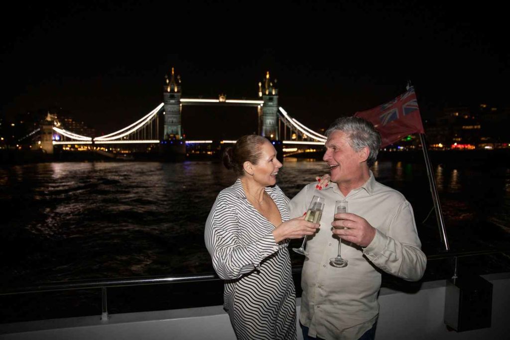 • 해가 진 후 템즈 강을 따라 크루즈를 타고 런던의 강변을 감상하세요. 라이브 연주자의 선곡된 노래를 들으며 거품이 가득한 고급 카나페 한 잔으로 저녁을 시작하세요.